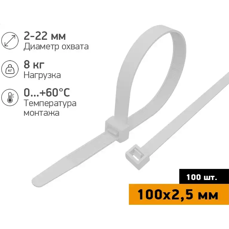 стяжка, 10 см x 2.5 мм, диаметр охвата 22 мм, цвет: белый, 100 шт.