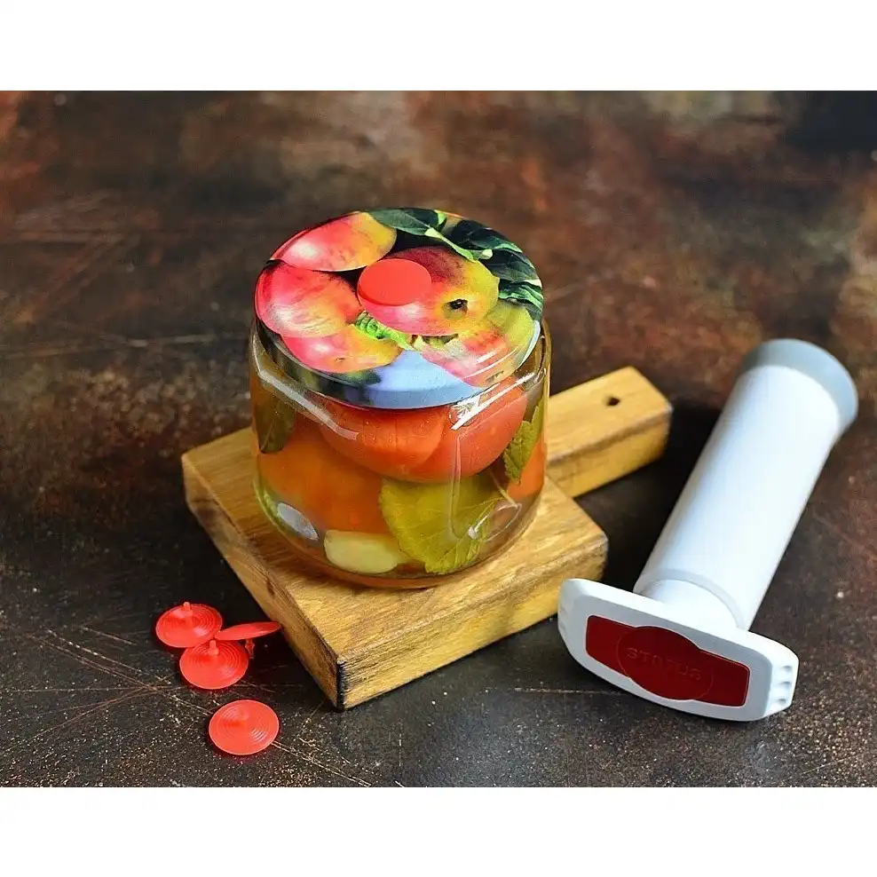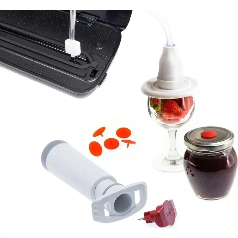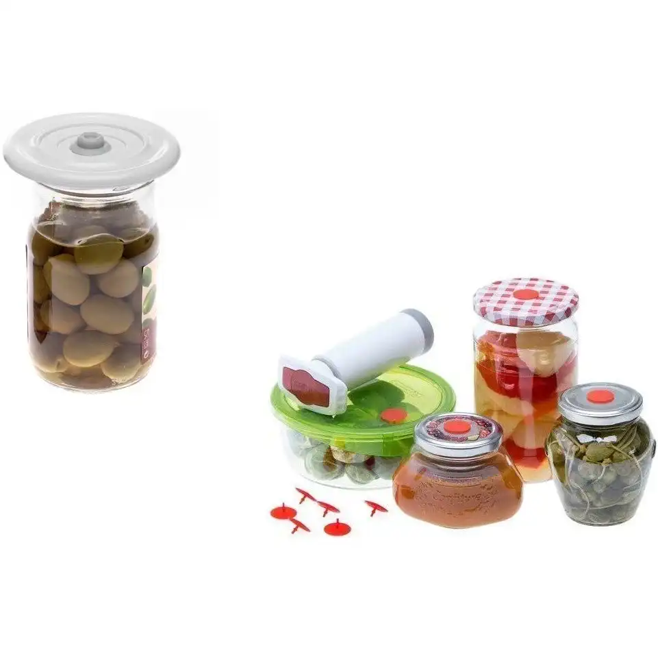 комплект для вакуумирования, универсальное решение для хранения продуктов, в набор входят: вакуумная крышка, 5 клапанов, насос и шланг