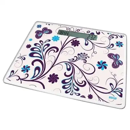 12 мес., www.mysteryelectronics.ru, Mystery, 200, да, 160х30 мм, стекло, электронные, 0.1, да, AAAx3, индикация перегрузки и низкого заряда батареи; часы; термометр, кг/фунты, MES-1810, рисунок