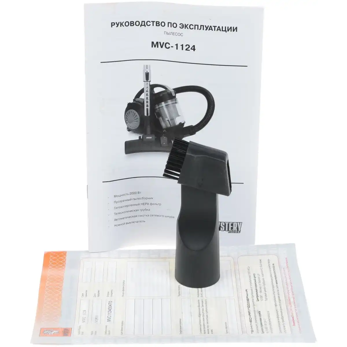 5.2 кг, 12 мес., телескопическая, сухая, сеть, да, напольный, www.mysteryelectronics.ru, Mystery, контейнер, 2000, 410 x 310 x 275 мм, MVC-1124, Скачать, насадка 2 в 1, насадка пол/ковер, оранжевый, чёрный, индикация заполнения пылесборника, циклонная система фильтрации