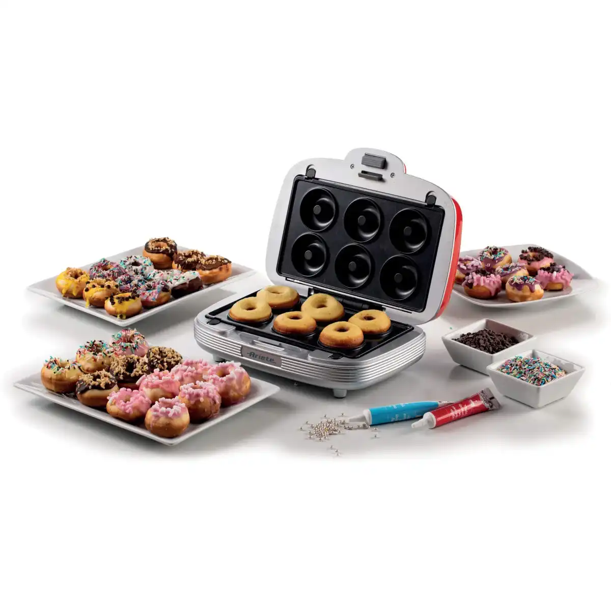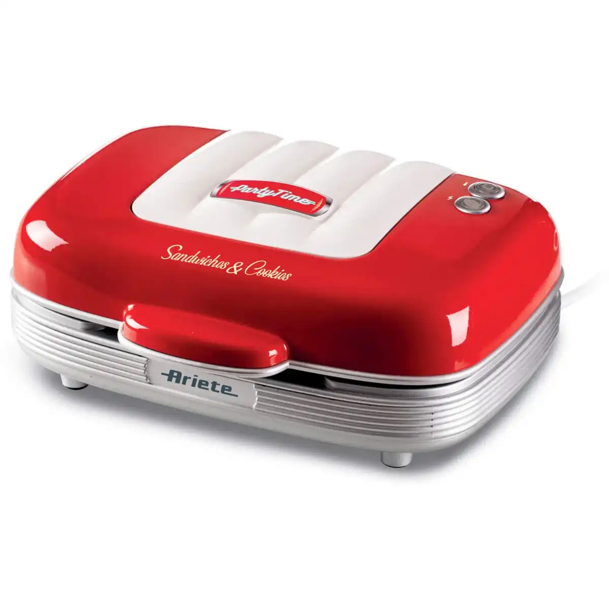 12 мес., металл, 700, да, включения, нагрева/готовности, Ariete, www.ariete.net, 2.75 кг, Скачать, 270 x 110 x 220 мм, кексы, пончики, сэндвич, 00C197200AR0, место хранения кабеля, фиксатор крышки, белый, красный, серебристый