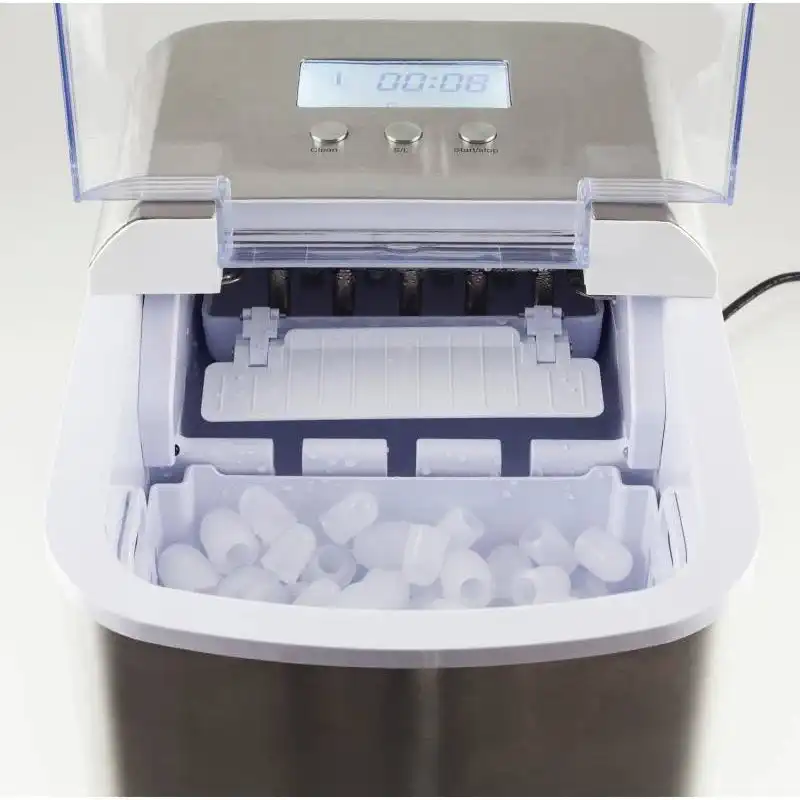 генератор льда, мощность: 120 Вт, производительность в день: 12 кг, первая порция кубиков льда за 6-13 минут, объём резервуара для воды: 2.2 л, компрессор, прозрачная крышка, индикатор уровня воды, два размера кубиков, корпус из нержавеющей стали