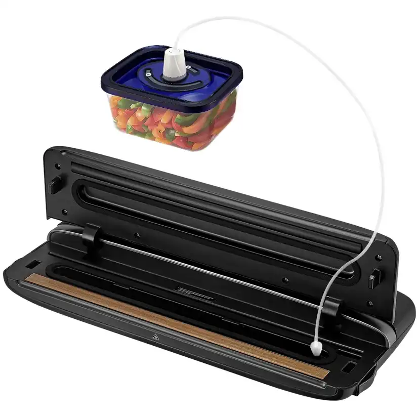 мощность: 110 Вт, создаваемое разрежение (максимум): 0.4-0.6 бар, сварка пакетов шириной до 27 см, в комплекте: шланг для откачки воздуха в контейнеры, запасной уплотнитель, съёмный контейнер вакуумной камеры, насадки для шланга и резак