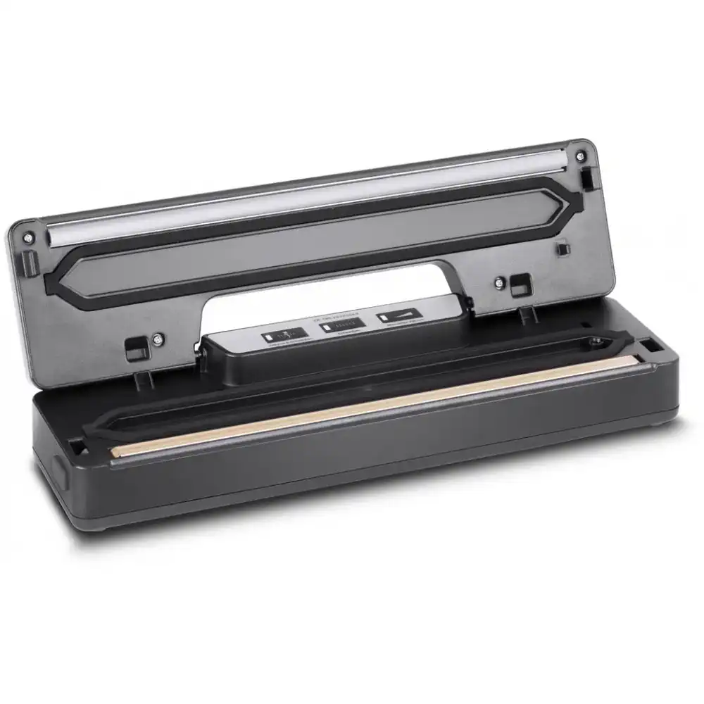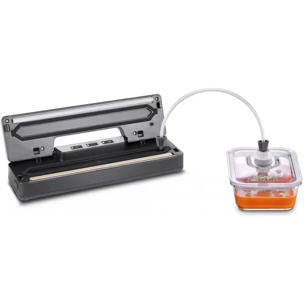 мощность: 100 Вт, скорость всасывания: до 9 л/мин, сварка пакетов шириной до 30 см, режимы: автоматическое откачивание и запаивание/ручное запаивание/импульсный режим, в комплекте: 10 пакетов (20 x 30 см), переходник для контейнеров