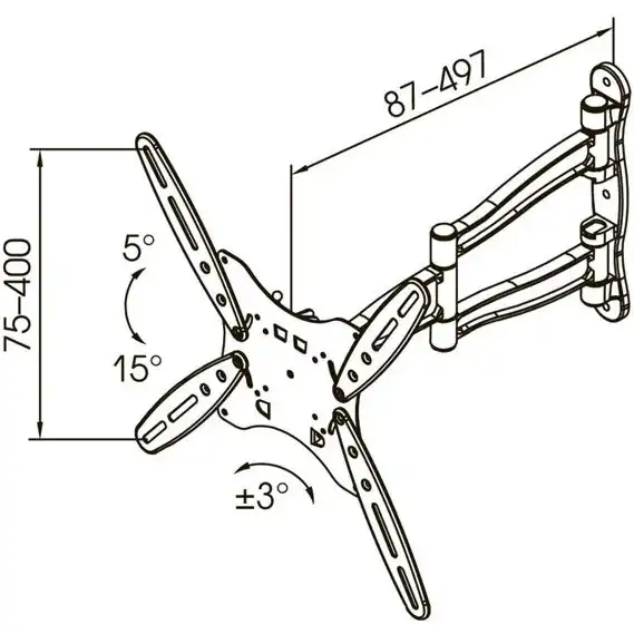 2 кг, 12 мес., чёрный, www.kromax.ru, настенный, Kromax, для телевизора/панели, выдвижной, наклонный, поворотный, 75х75, 100х100, 200х100, 200х200, 300х200, 300х300, 400х300, 400х400, 15-55, 87-497, TECHNO-5, 35, регулировка наклона: 15°регулировка поворота: 180° + вращение 3°
