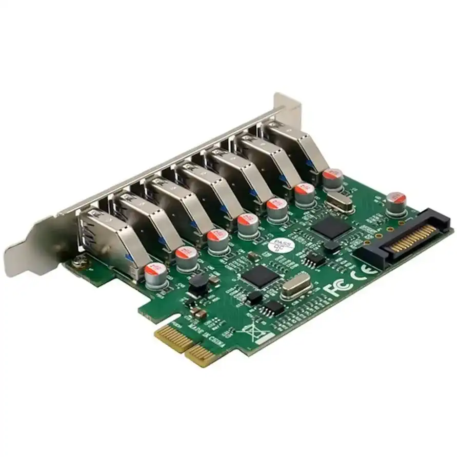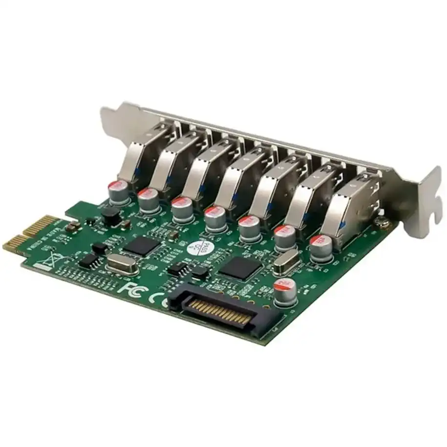 контроллер: USB 3.2 Gen1, интерфейс: PCI Express 2.0 x1, внешние порты: 7x USB Type-A 3.2 Gen1 (5 Гб/с), питание: от SATA-коннектора, чип: VIA VL805 + VL812, полноразмерная монтажная планка (HF)