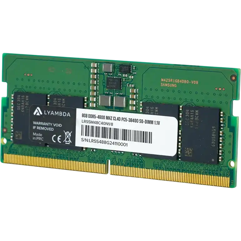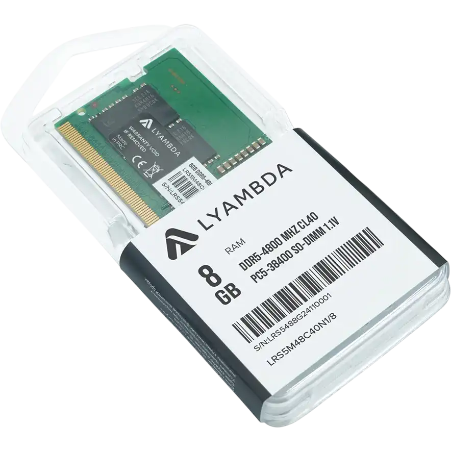 DDR5, SO-DIMM, 0.014 кг, www.lyambda.com, Lyambda, 36 мес., зелёный, 8 Гб, 1, 8 Гб, нет, 4800, 1.1, 40, 77, 38400, 30, 39, 39, LRS5M48C40N1/8, Скачать