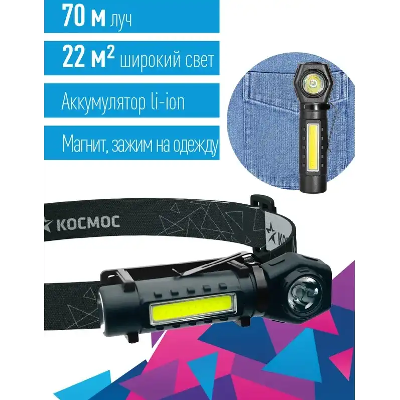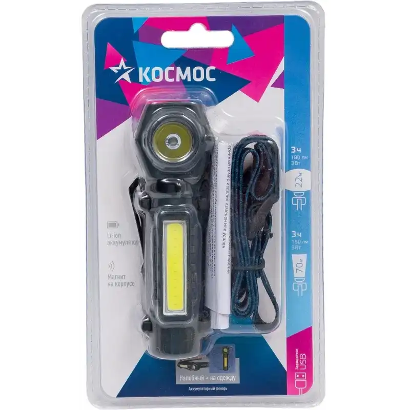 пластик, 3, 1200, 3, официальная гарантия производителя, регулировка угла наклона, IP54, налобный, собственный аккумулятор, от USB, КОСМОС, www.kosmos.ru, KOC508Lit, 180, 70, 4500, 1 шт. x 18650