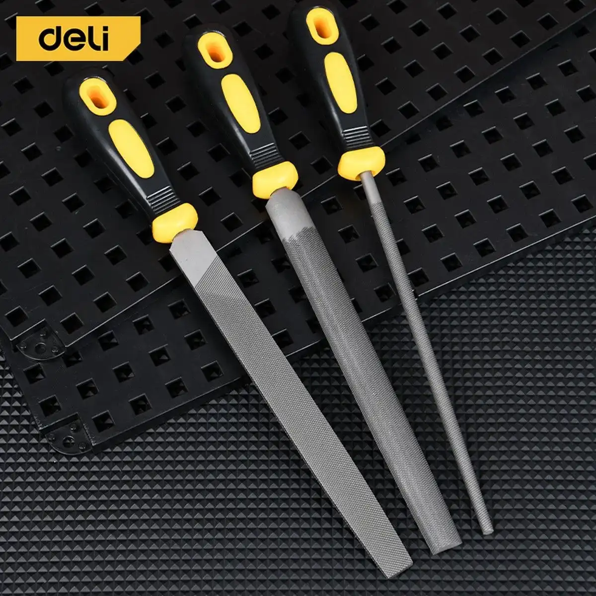 официальная гарантия производителя, универсальный, Deli, www.deliworld.com, блистер, материал: инструментальная сталь T12,комплект из трех напильников по дереву - двухсторонний плоский, двухсторонний плоский/закругленный, круглый, 3 x напильник, DL352083, дерево, 3