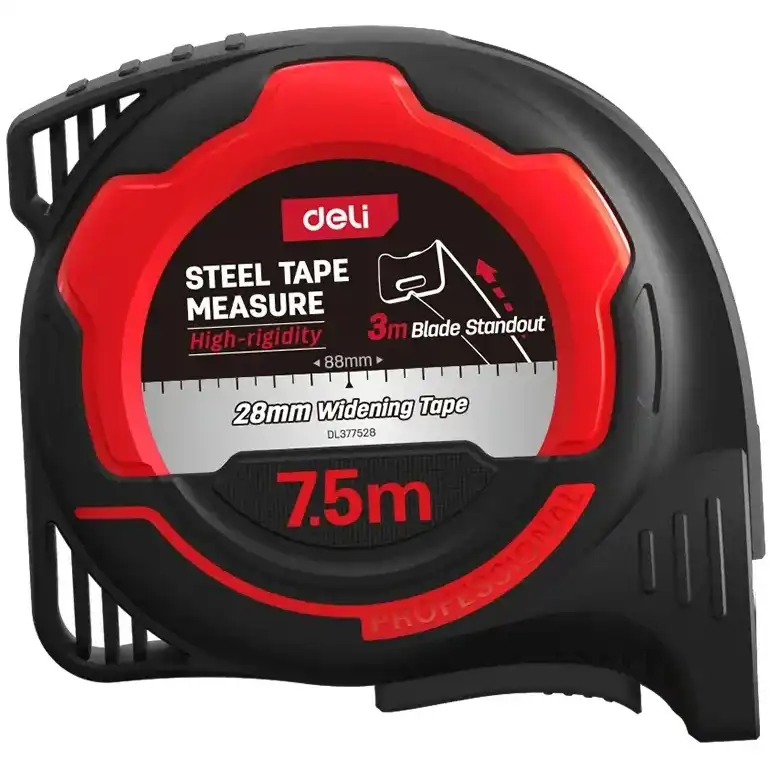 официальная гарантия производителя, Deli, www.deliworld.com, сантиметры, жёлтый, рулетка, II, клипса для крепления на ремень, фиксация ленты, 28, 7.5 м, DL377528