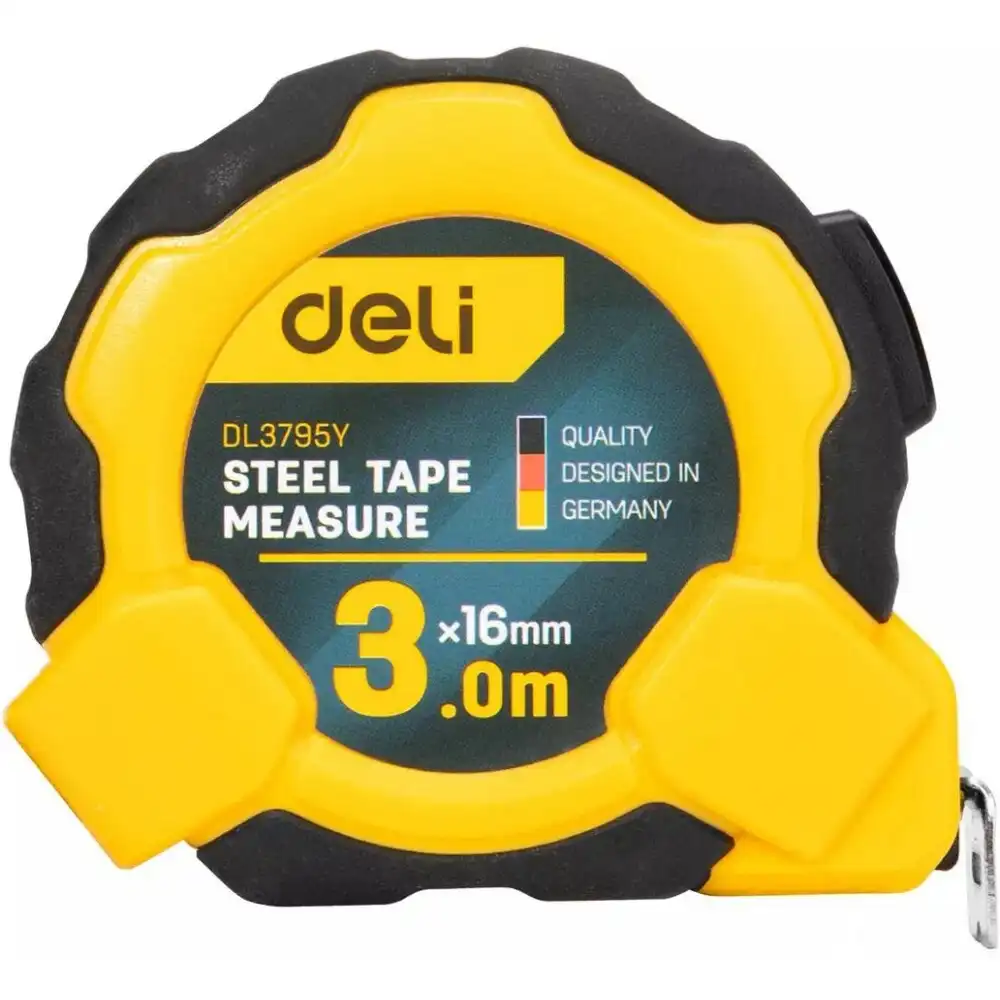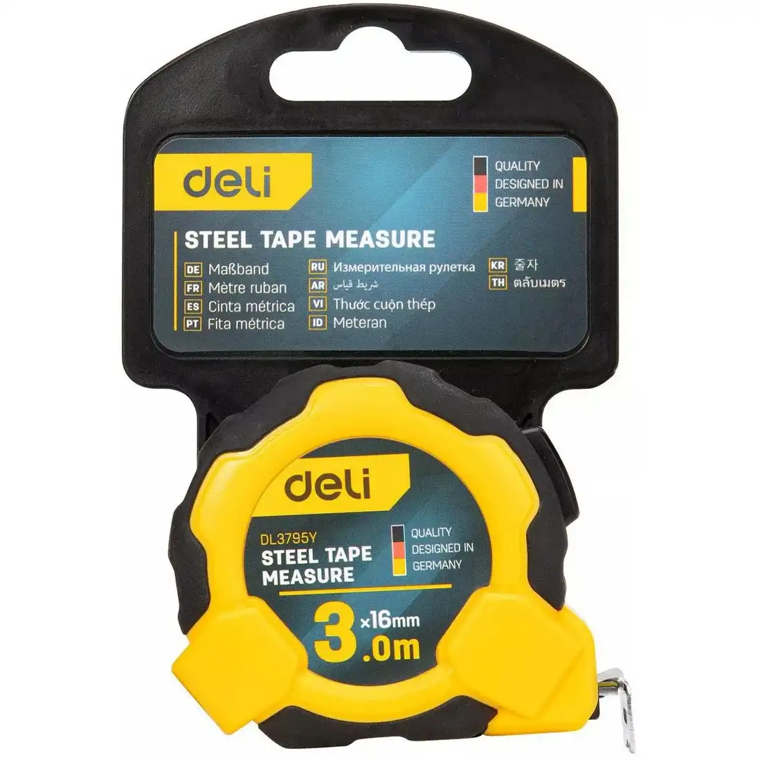 официальная гарантия производителя, Deli, www.deliworld.com, жёлтый, рулетка, 3 м, 16, клипса для крепления на ремень, фиксация ленты, сантиметры/дюймы, DL3795