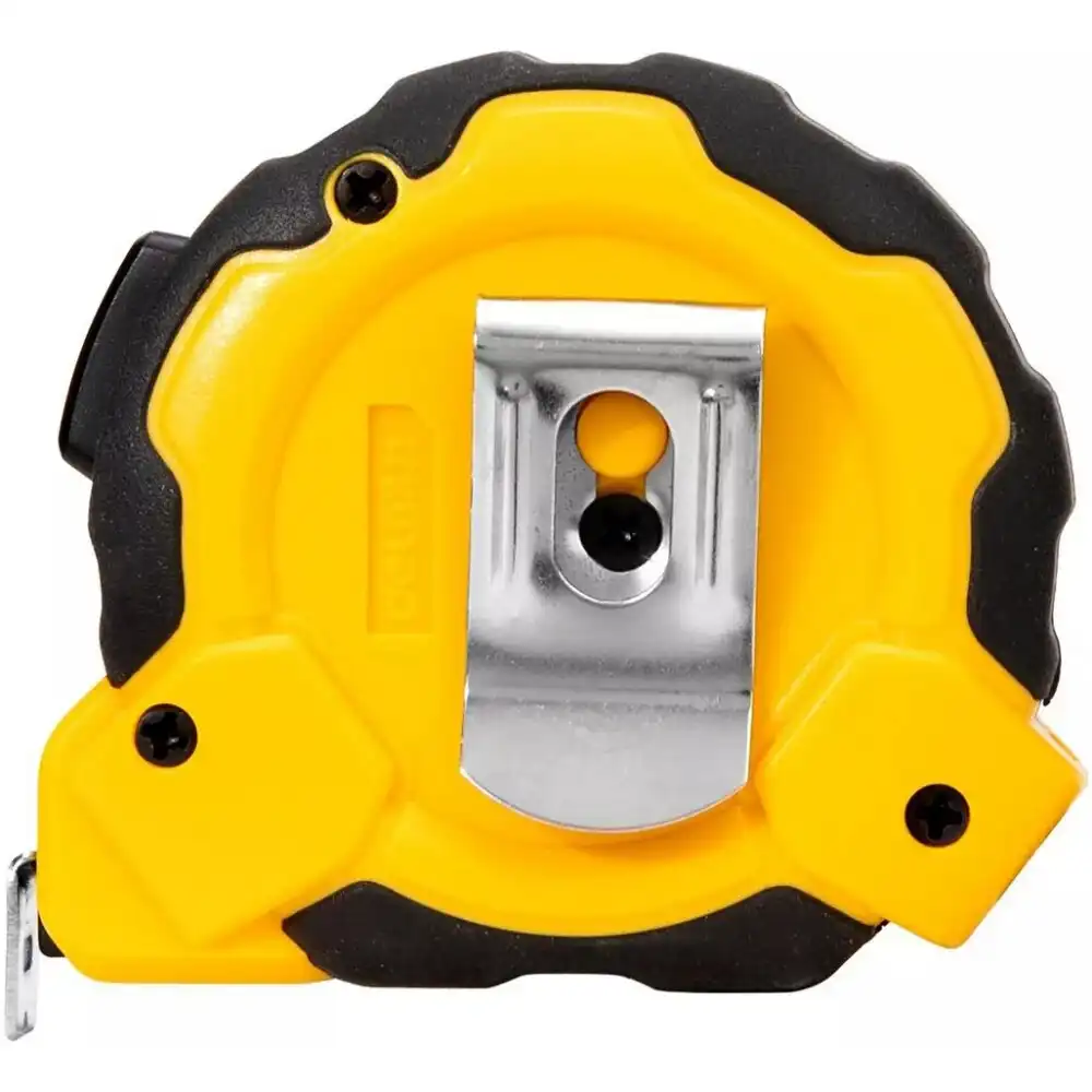 длина 5 м, ширина 19 мм, измеряет в сантиметрах, клипса для крепления на ремень, фиксация ленты, обрезиненный корпус, жёлтая лента