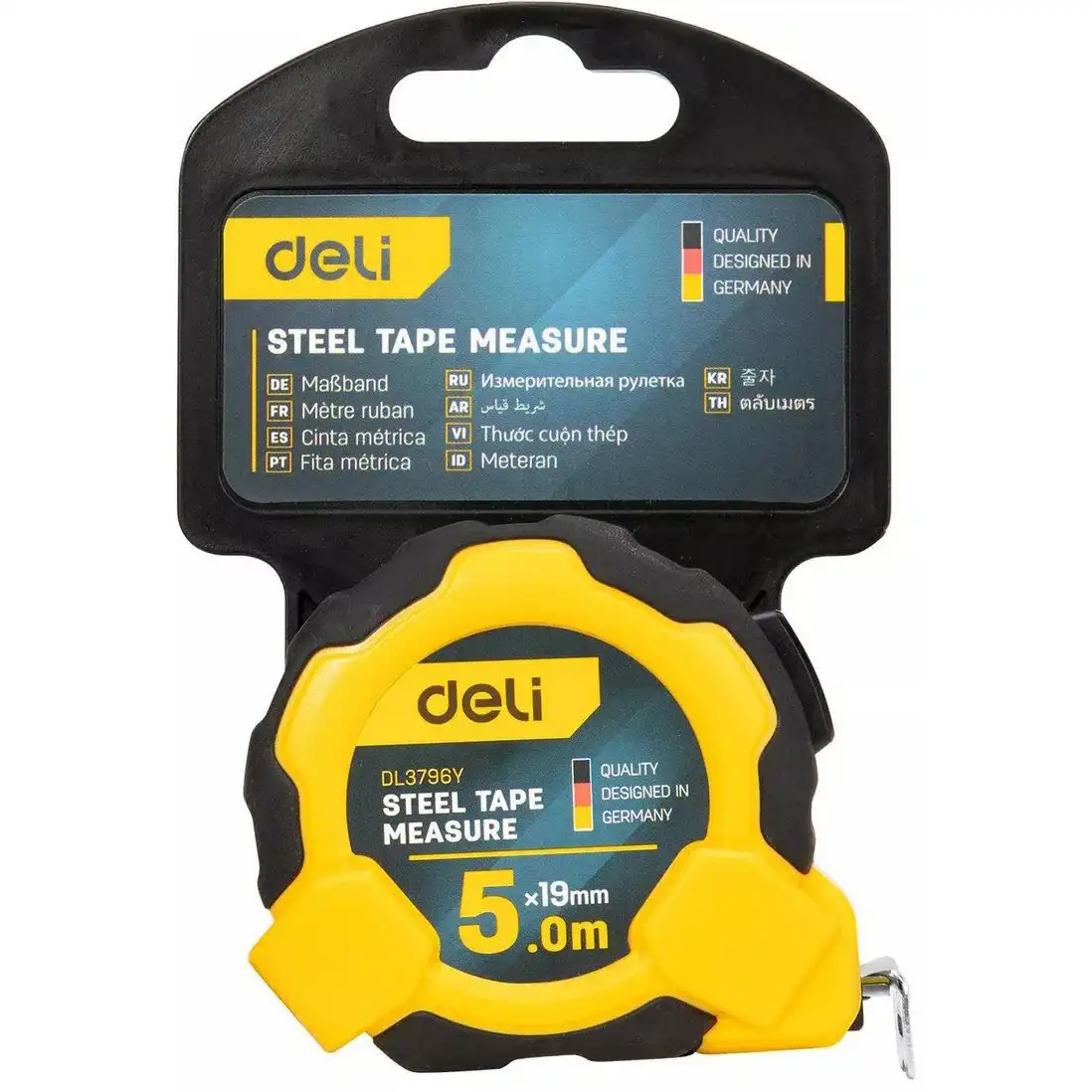 официальная гарантия производителя, Deli, www.deliworld.com, жёлтый, рулетка, 5 м, 19, клипса для крепления на ремень, фиксация ленты, сантиметры/дюймы, DL3796