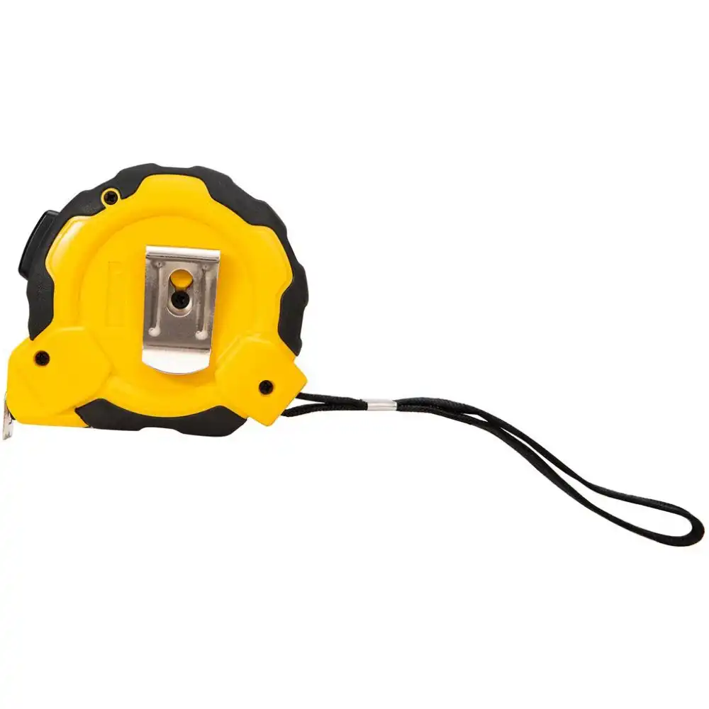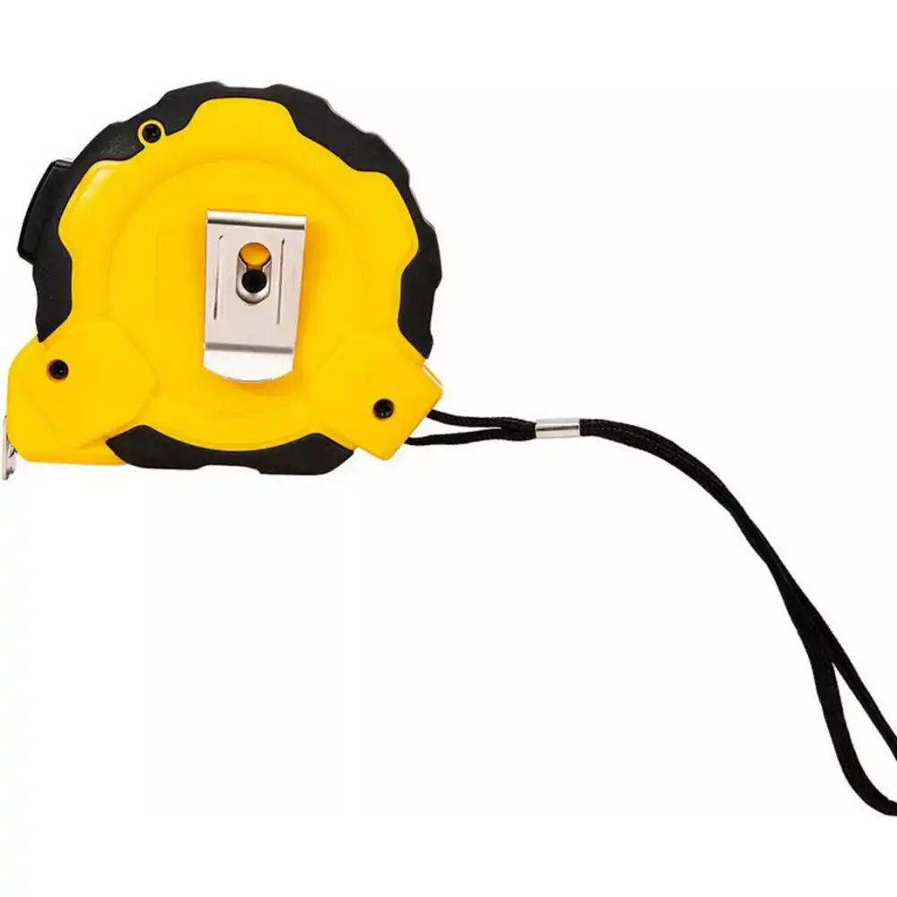 рулетка, длина 7.5 м, ширина 28 мм, измеряет в сантиметрах и дюймах, клипса для крепления на ремень, фиксация ленты, шнурок для подвеса, жёлтая лента