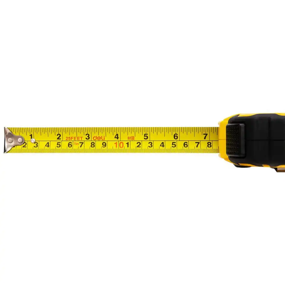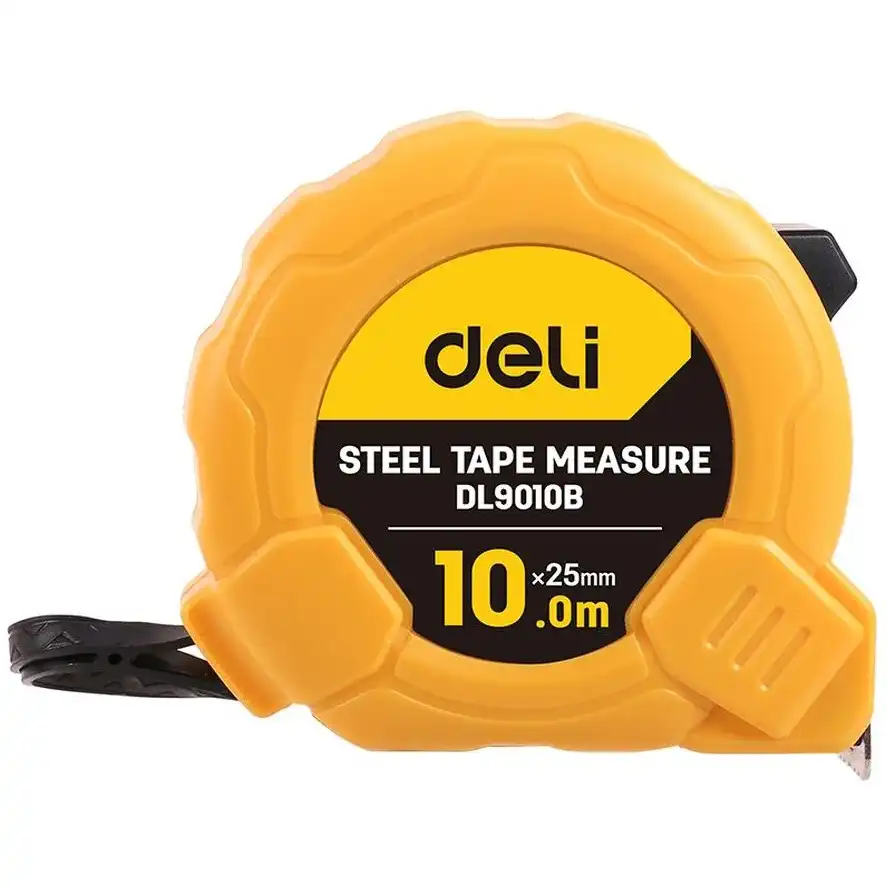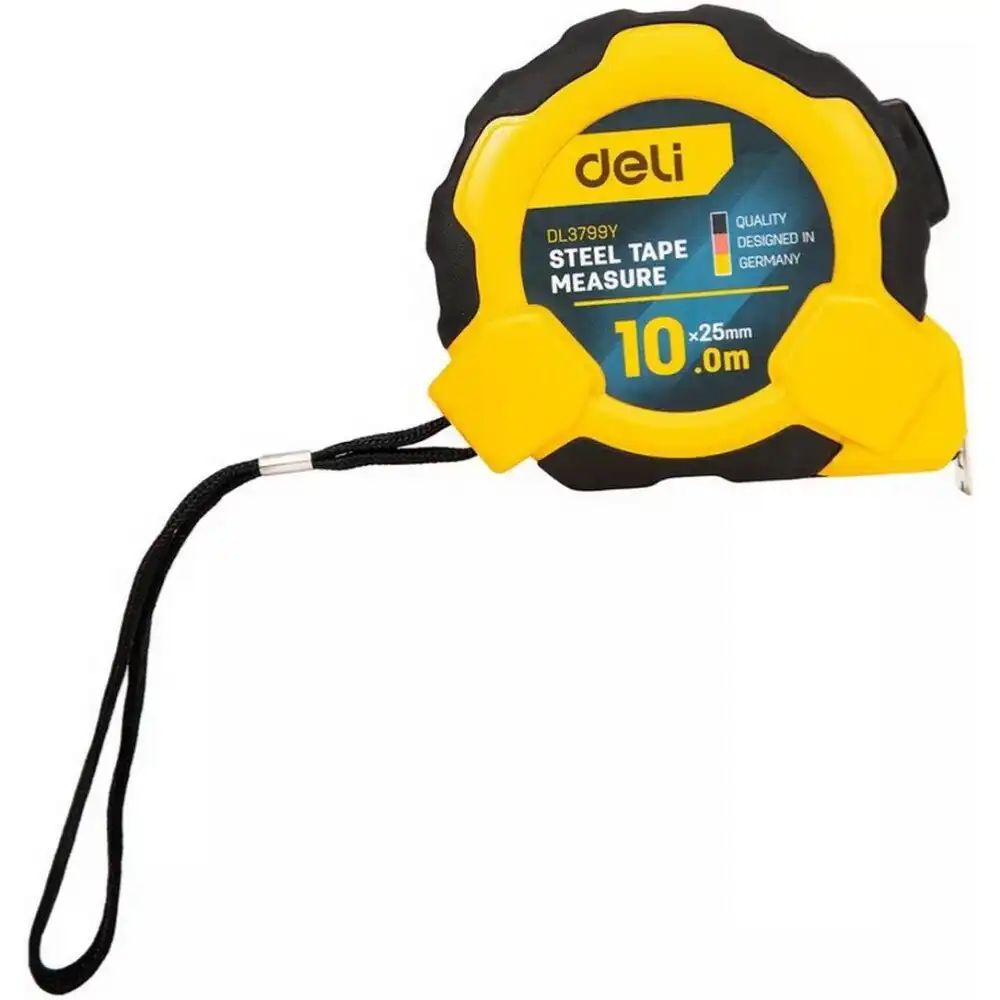 официальная гарантия производителя, Deli, www.deliworld.com, жёлтый, 10 м, 25, рулетка, сантиметры/дюймы, клипса для крепления на ремень, фиксация ленты, шнурок для подвеса, DL3799