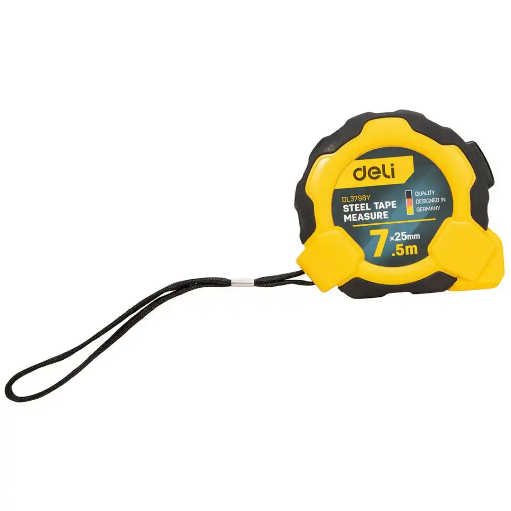 официальная гарантия производителя, Deli, www.deliworld.com, жёлтый, рулетка, 28, 7.5 м, сантиметры/дюймы, DL3798, клипса для крепления на ремень, фиксация ленты, шнурок для подвеса