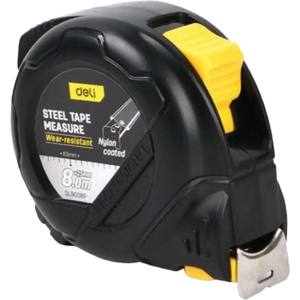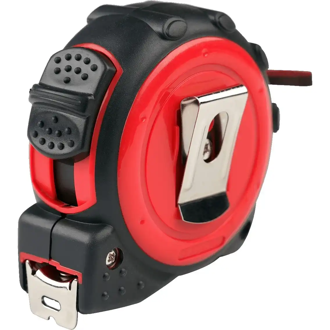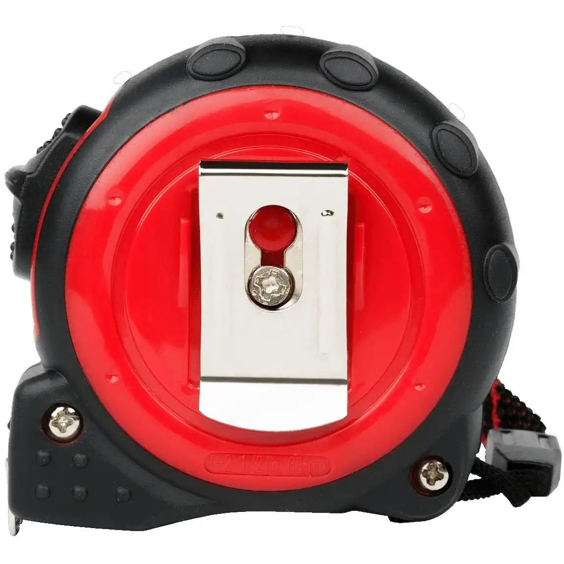 рулетка, длина 8 м, ширина 25 мм, измеряет в сантиметрах, клипса для крепления на ремень, двухсторонняя шкала, фиксация ленты, шнурок для подвеса, обрезиненный корпус, белая лента
