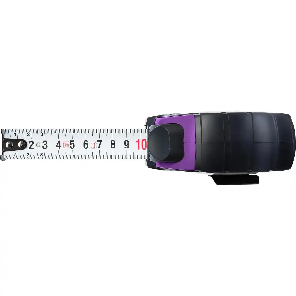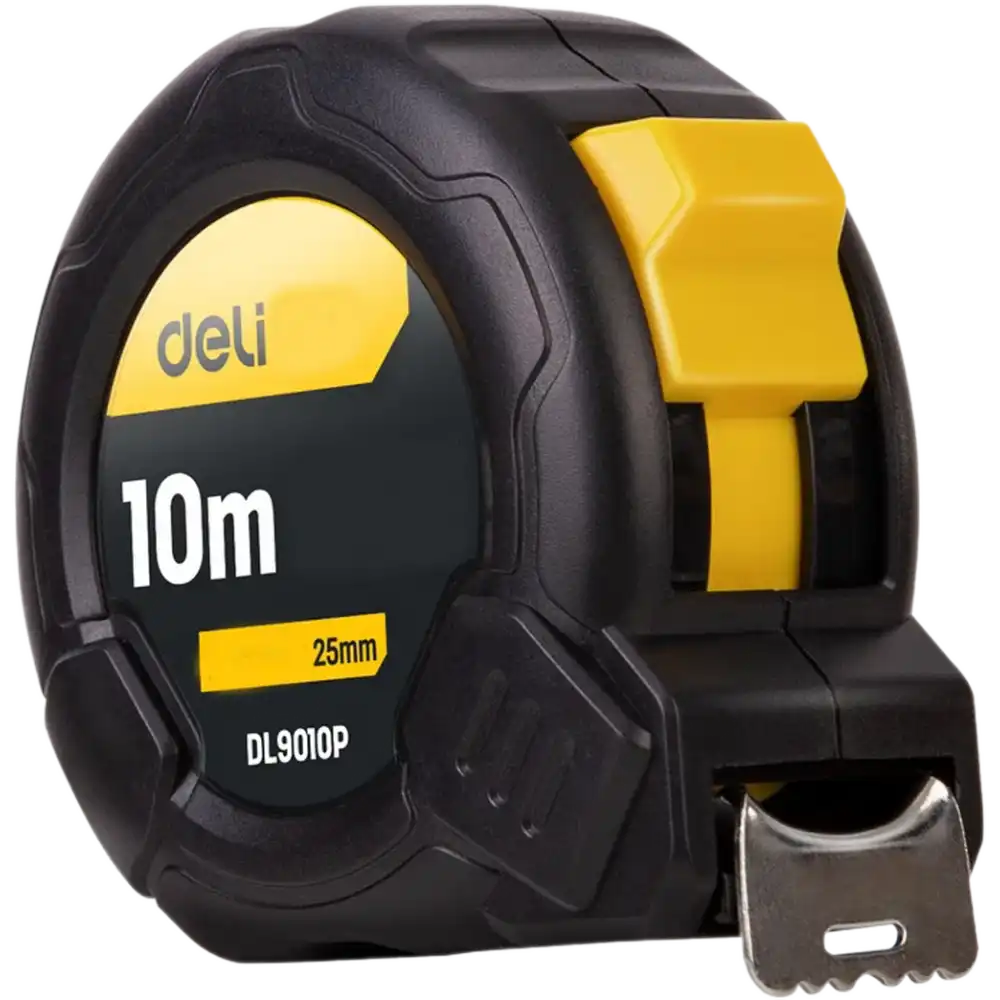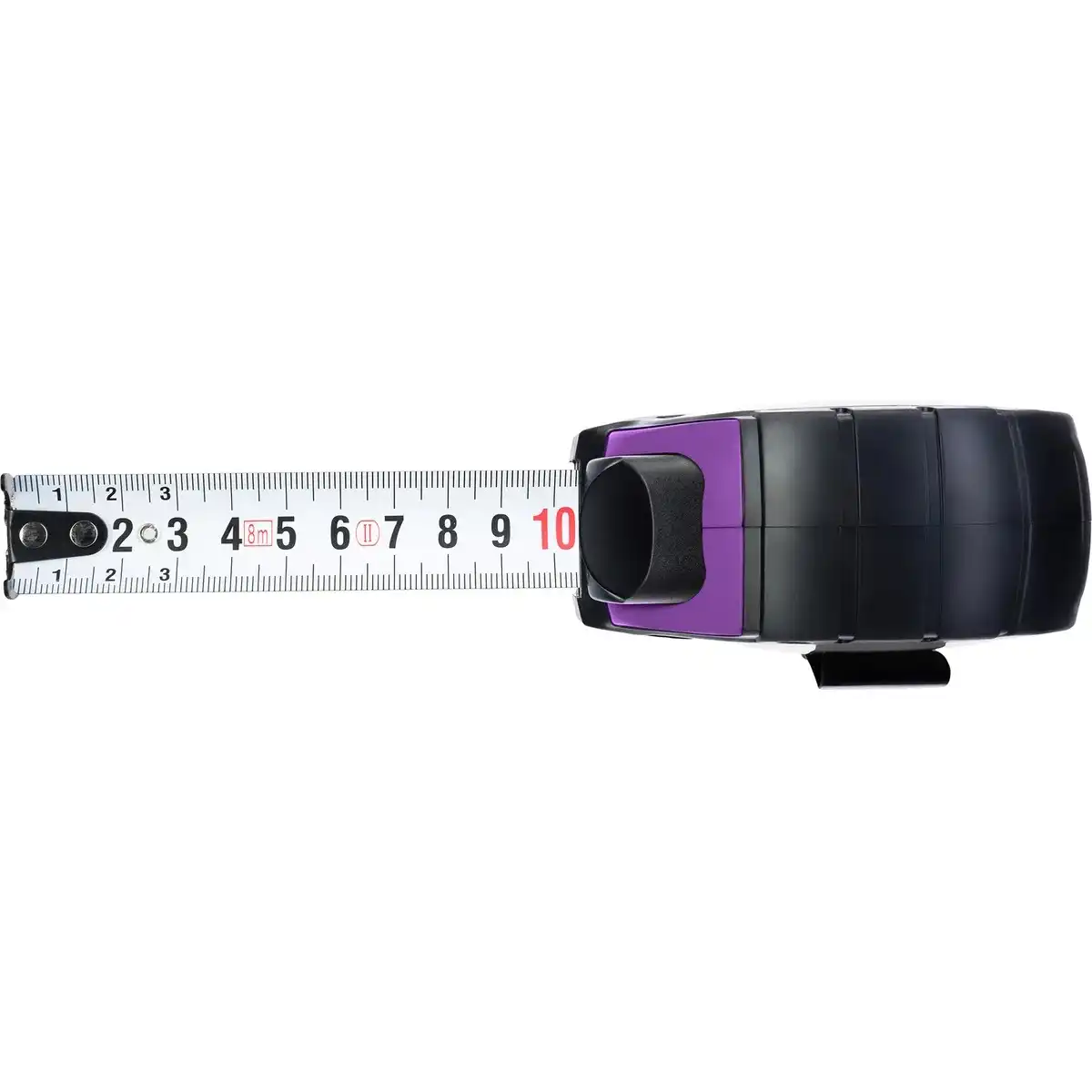 рулетка, длина 10 м, ширина 25 мм, измеряет в сантиметрах, клипса для крепления на ремень, двухсторонняя шкала, фиксация ленты, шнурок для подвеса, обрезиненный корпус, белая лента