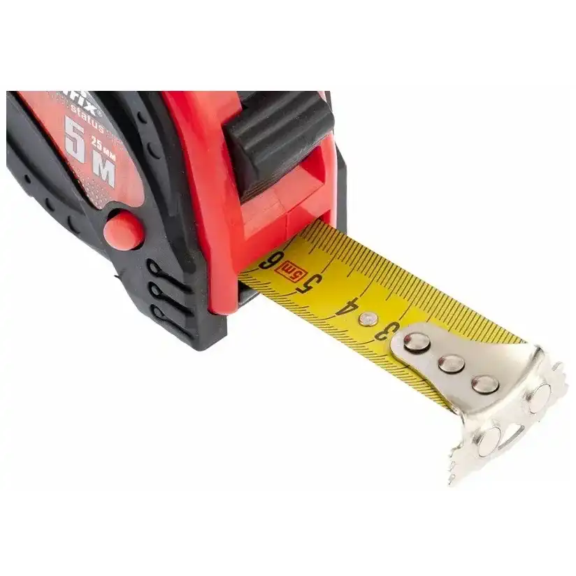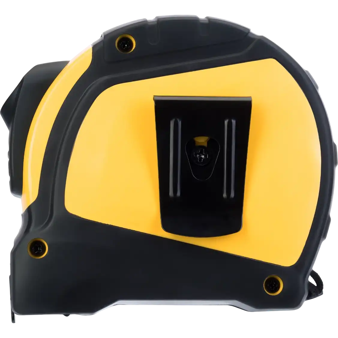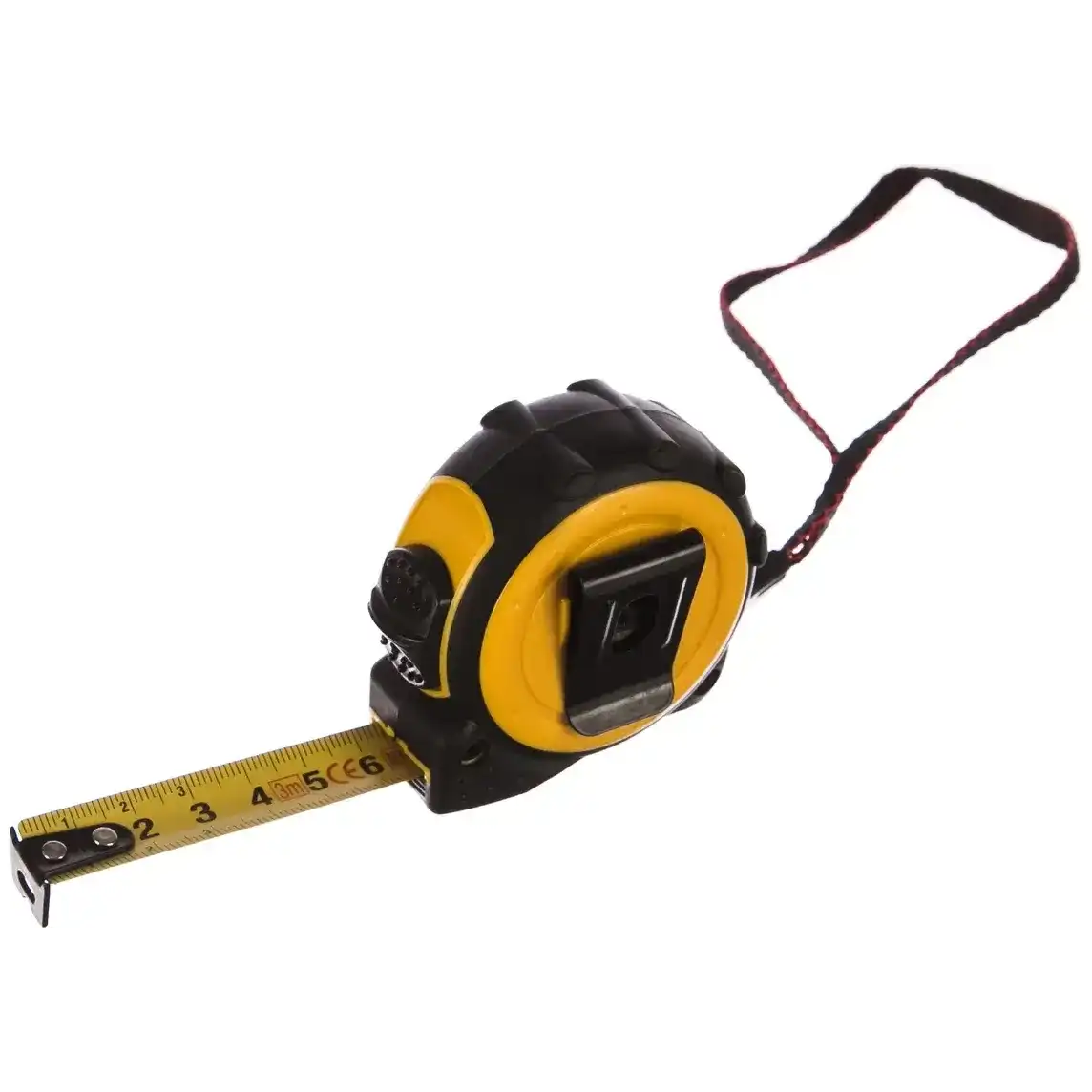 рулетка, длина 5 м, ширина 25 мм, измеряет в сантиметрах, магнитный зацеп, клипса для крепления на ремень, фиксация ленты, шнурок для подвеса, обрезиненный корпус, жёлтая лента