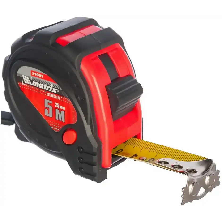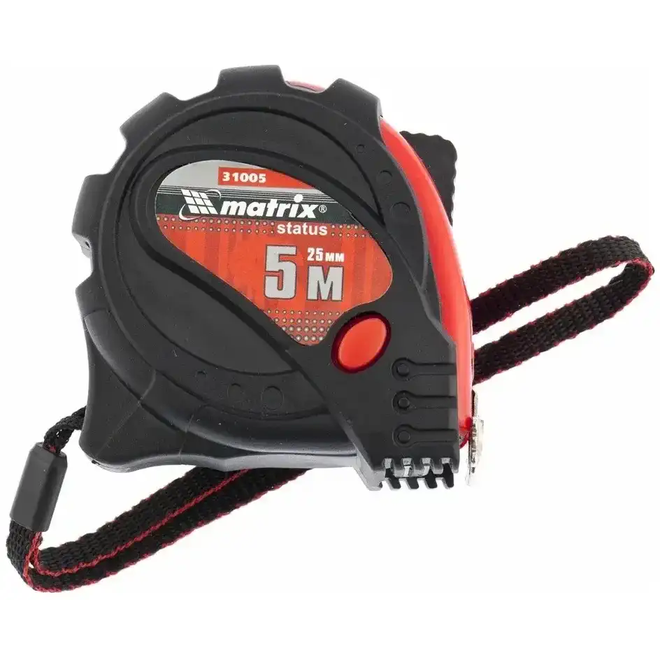 официальная гарантия производителя, Matrix, matrizeh.com, сантиметры, жёлтый, 25, рулетка, 5 м, нержавеющая сталь, пластик, клипса для крепления на ремень, магнитный зацеп, обрезиненный корпус, фиксация ленты, шнурок для подвеса, 31005