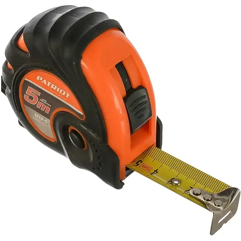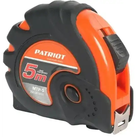 PATRIOT, www.onlypatriot.com, официальная гарантия производителя, сантиметры, жёлтый, 25, рулетка, 5 м, клипса для крепления на ремень, обрезиненный корпус, фиксация ленты, 1 мм, 350005005