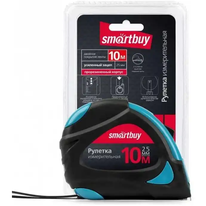 официальная гарантия производителя, SmartBuy, www.smartbuy-russia.ru, сантиметры, жёлтый, 10 м, 25, рулетка, 1 мм, клипса для крепления на ремень, обрезиненный корпус, фиксация ленты, шнурок для подвеса, SBT-MTP-1025P5
