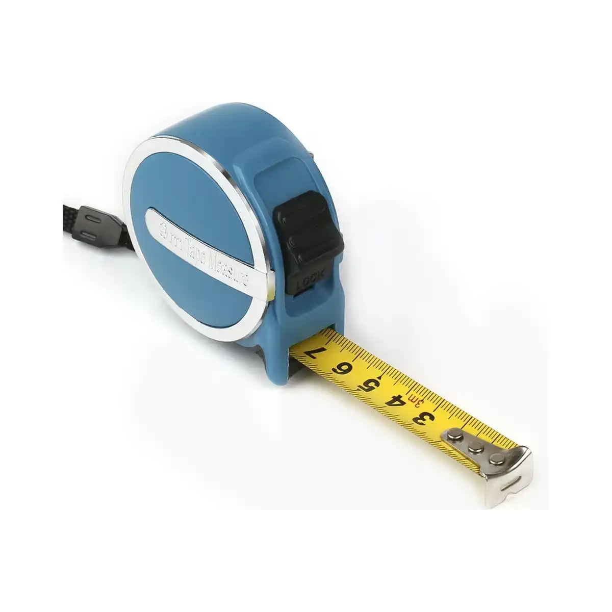 рулетка, длина 10 м, ширина 25 мм, измеряет в сантиметрах, клипса для крепления на ремень, фиксация ленты, шнурок для подвеса, обрезиненный корпус, белая лента