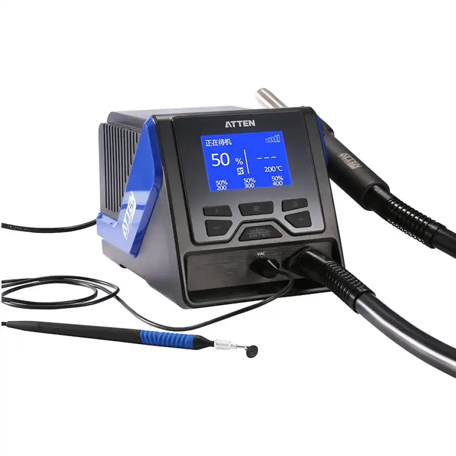 да, 1000, официальная гарантия производителя, паяльная станция, Atten, www.atten.com, 480, преимущества: оборудована ЖК-дисплеем и обладает мощностью 1000 Вт, оборудована вакуумным пинцетом для захвата компонентов, бесщеточный вентилятор, до 120л/мин комплектация демонтажной установки: базо, 230, GT-8102