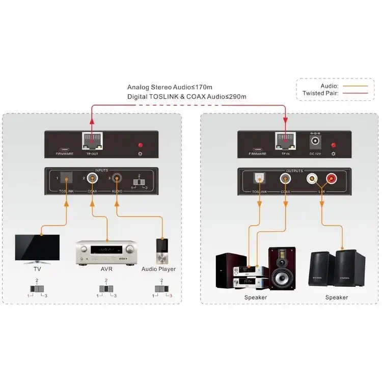 комплект передатчик и приемник аудио по витой паре Digis, стерео / коаксиальный / оптический (TOSLINK), передпача стерео до 170м и цифрового аудио до 290м, POC от приемника
