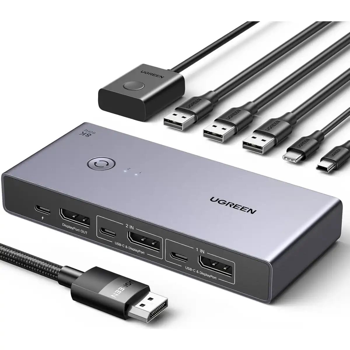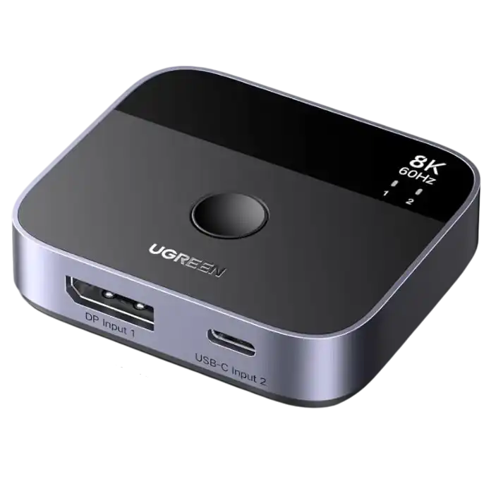 переключатель DisplayPort 1.4; входы: DisplayPort, USB Type-C; выходы: DisplayPort; поддержка: 8K@60 Гц, 3D, HDCP 2.3, HDR 10+; питание: USB Type-C; переключение между подключёнными устройствами одной кнопкой