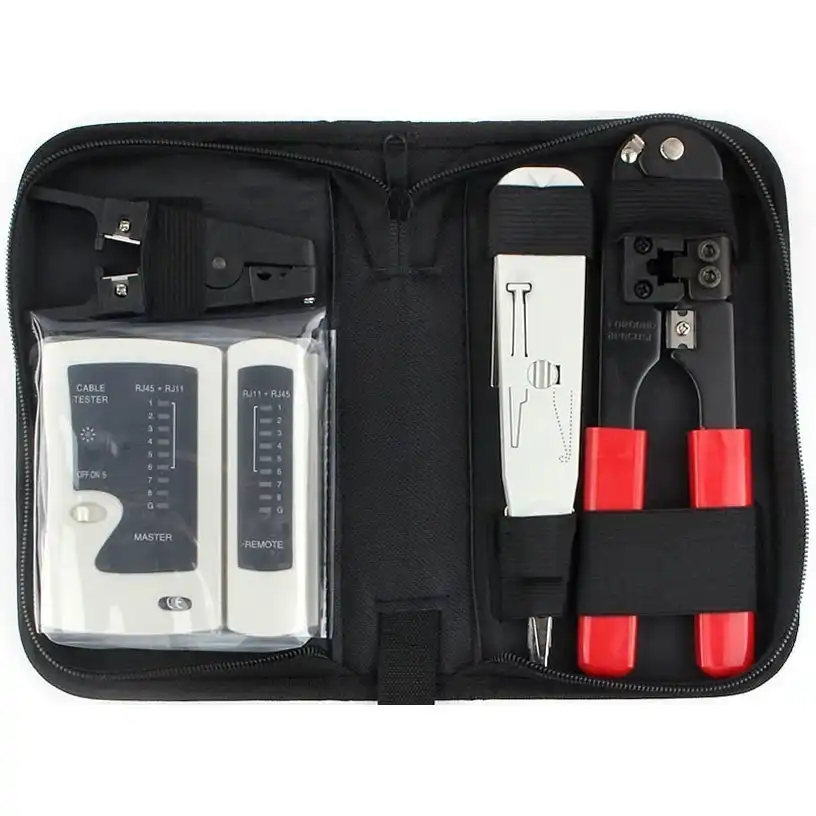 инструмент для построения локальной сети: инструмент для обрезки проводов и обжима разъемов 8P8C / RJ45, инструмент для ударного монтажа контактов, кабельный тестер (RJ45), инструмент для зачистки проводов (3.2 - 9 мм)