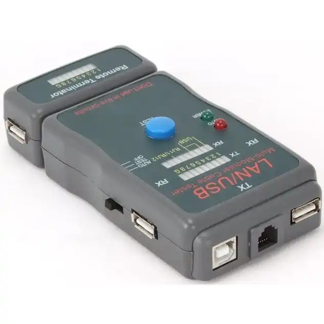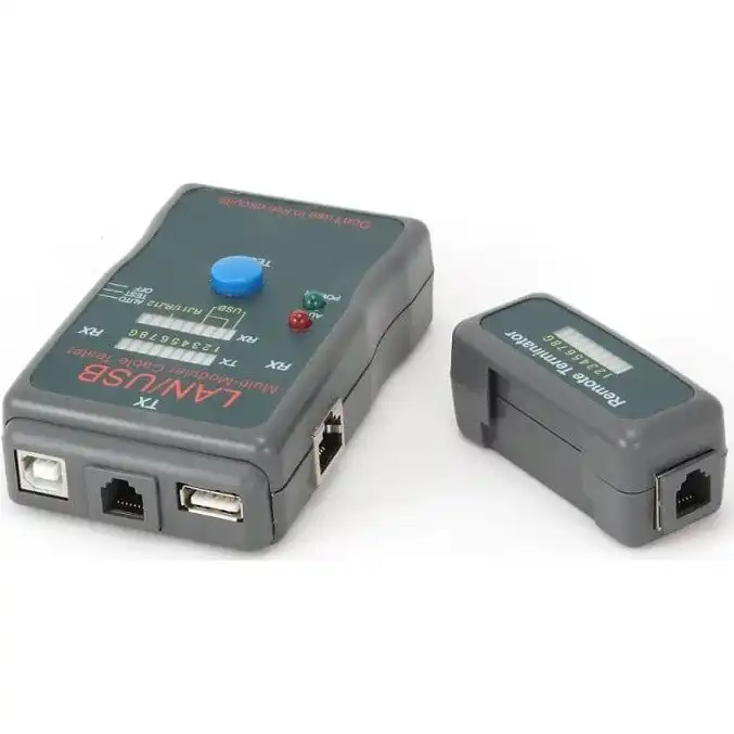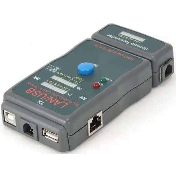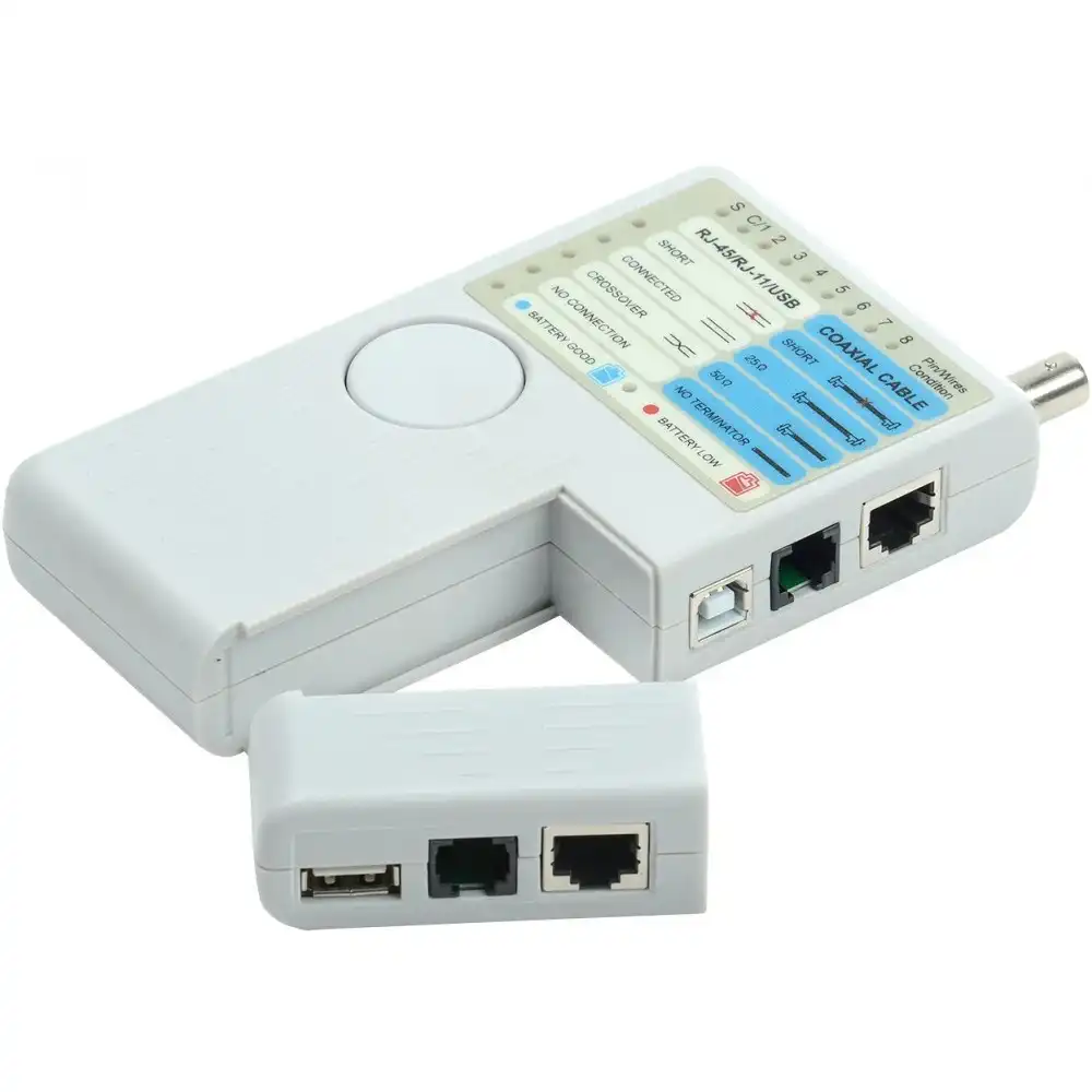 тестер для витой пары, поддерживает разъёмы RJ45, RJ11, BNC, USB, проверка правильности монтажа, заземления, целостности изоляции, компактный размер, защита IP20, с элементом питания, чехол в комплекте