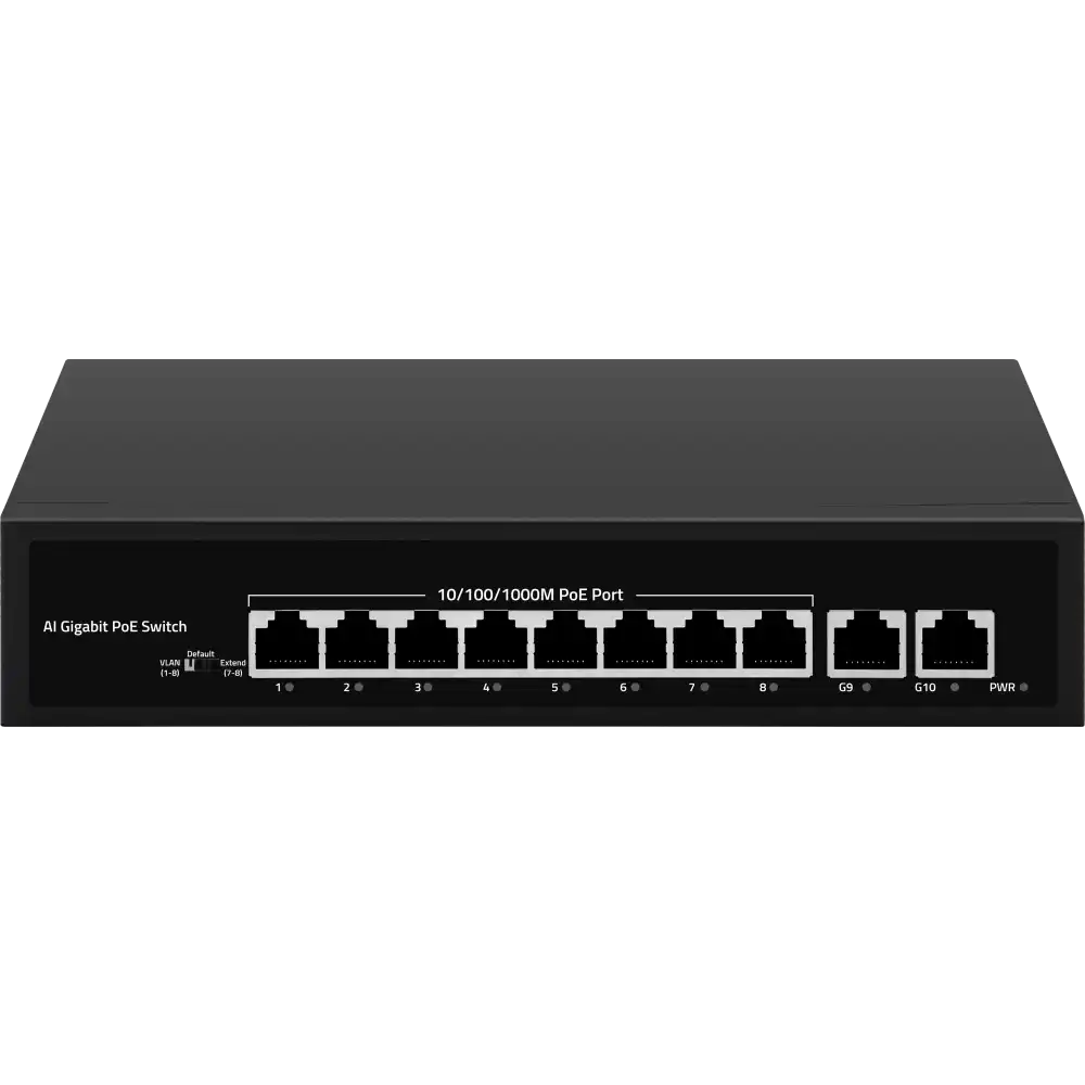 неуправляемый коммутатор, пропускная способность: 20 Гбит/с, 8xRJ-45 (1 Гбит/с), uplink-порты: 2xRJ-45 (1 Гбит/с), порты с PoE: 8