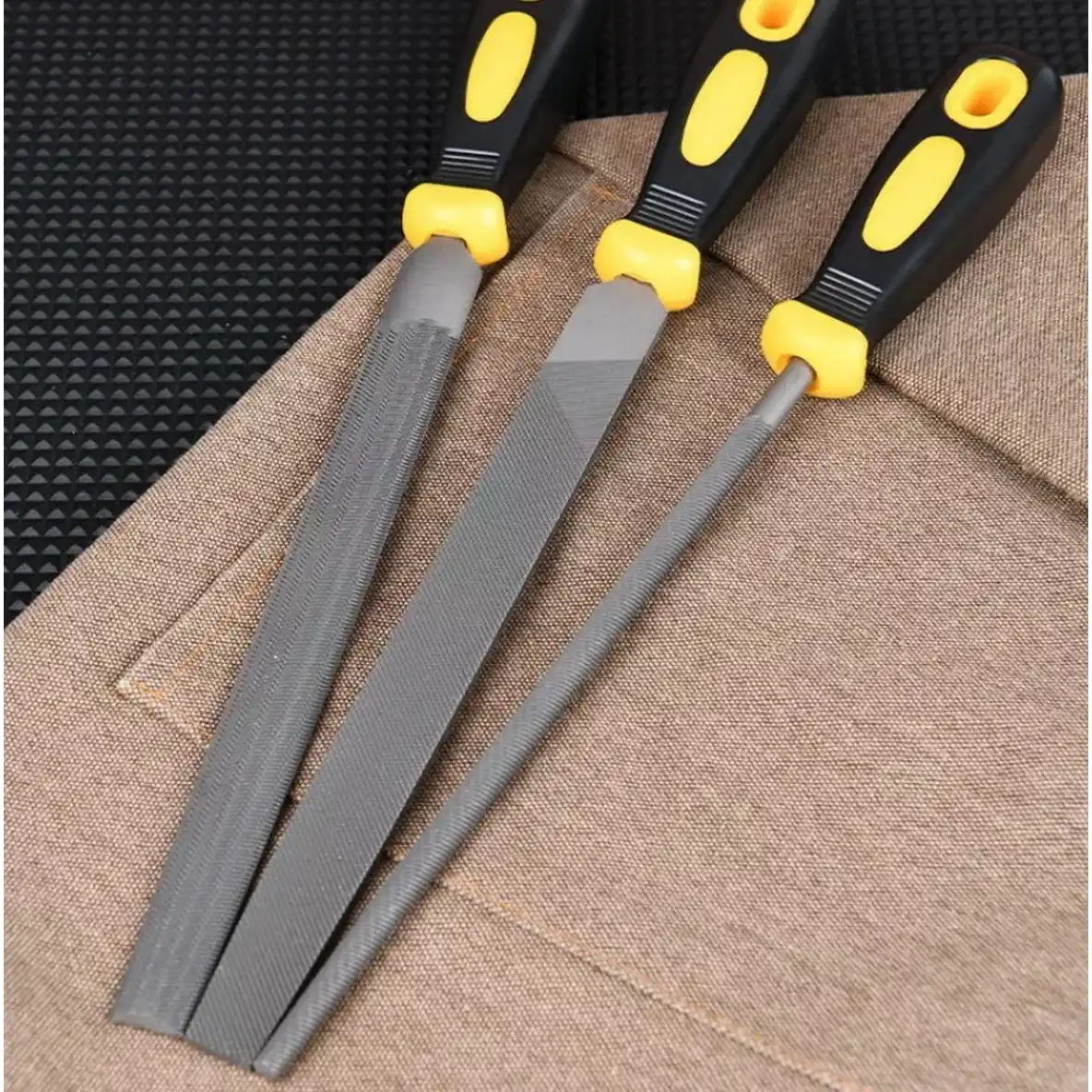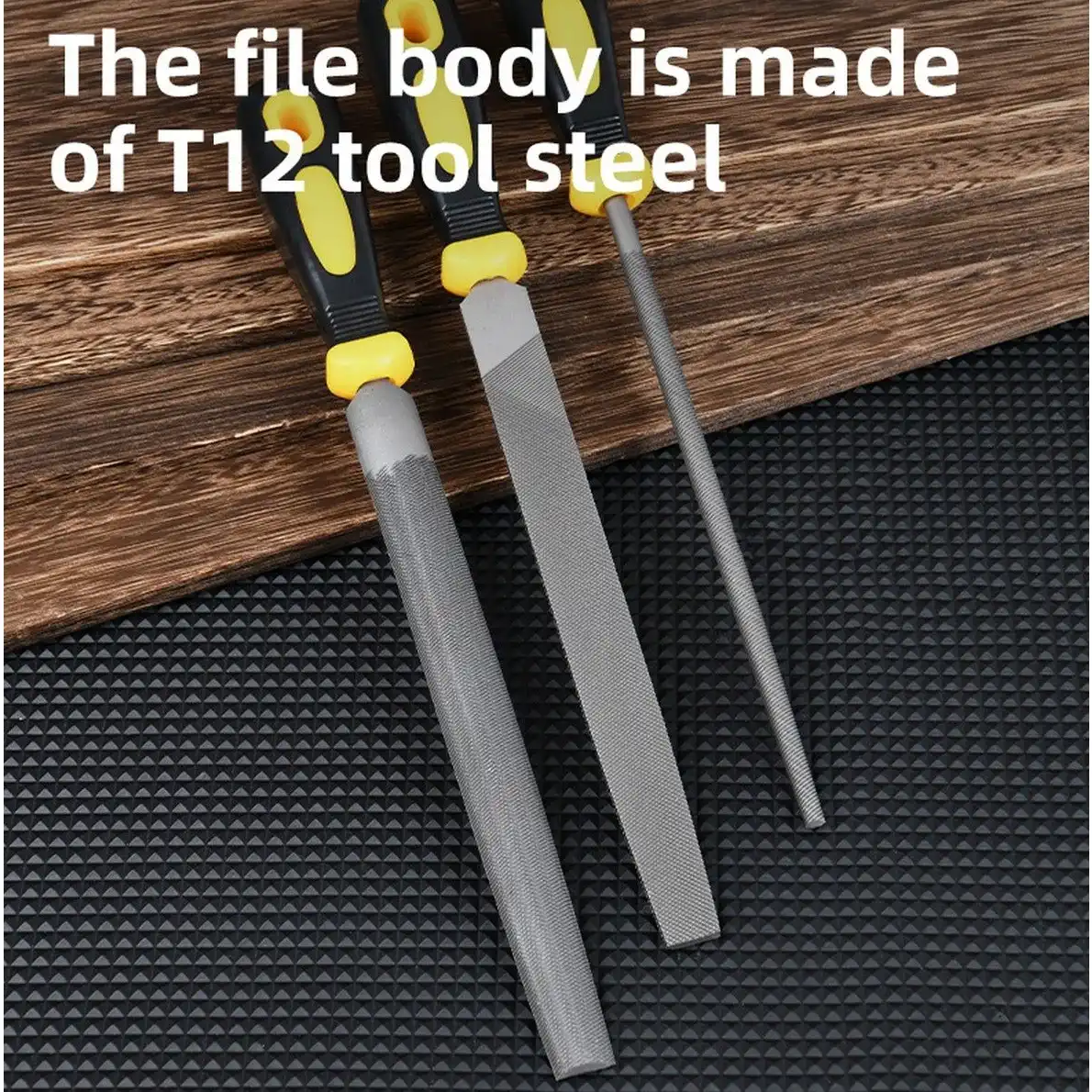 материал: инструментальная сталь T12,комплект из трех напильников по дереву — двухсторонний плоский, двухсторонний плоский/закругленный, круглый