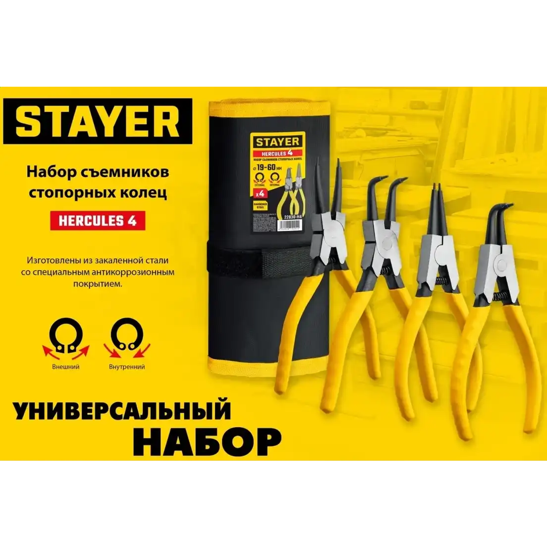 Набор съемников стопорных колец STAYER Hercules-4, 4 шт, 160 мм 22830-H4 предназначен для монтажа и демонтажа внутренних или внешних стопорных колец. Возвратная пружина упрощает работу. Изогнутые наконечники для работы в труднодоступных местах. Антикоррозиойной защитное покрытие продлевает срок службы. Нейлоновой чехол для удобного хранения и транспортировки.