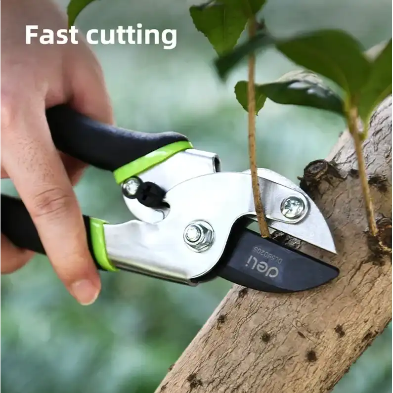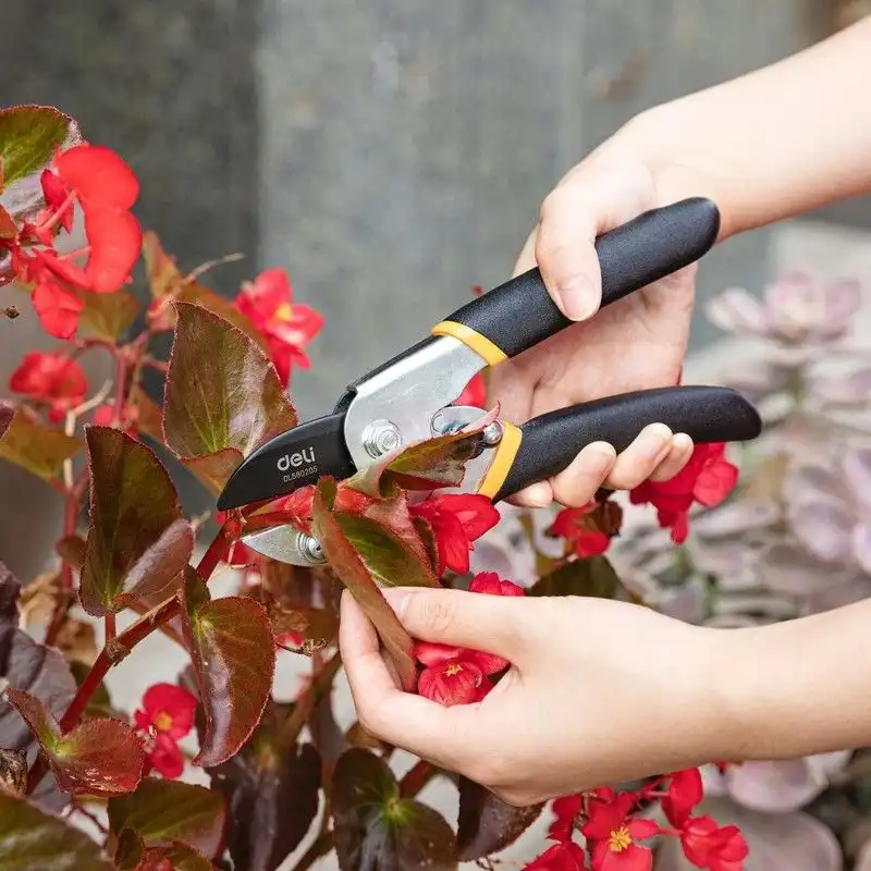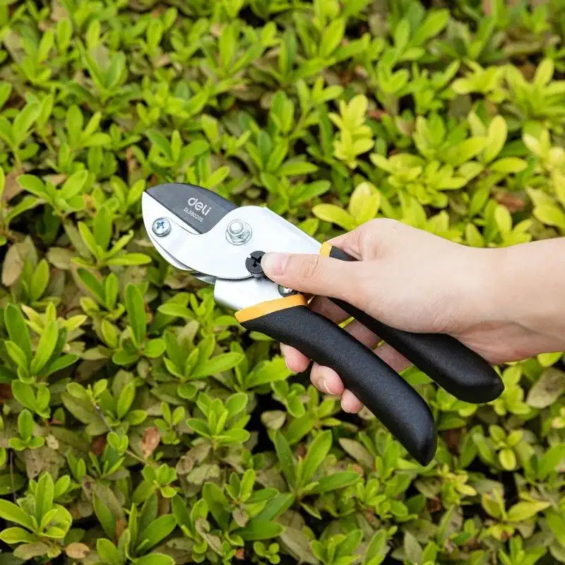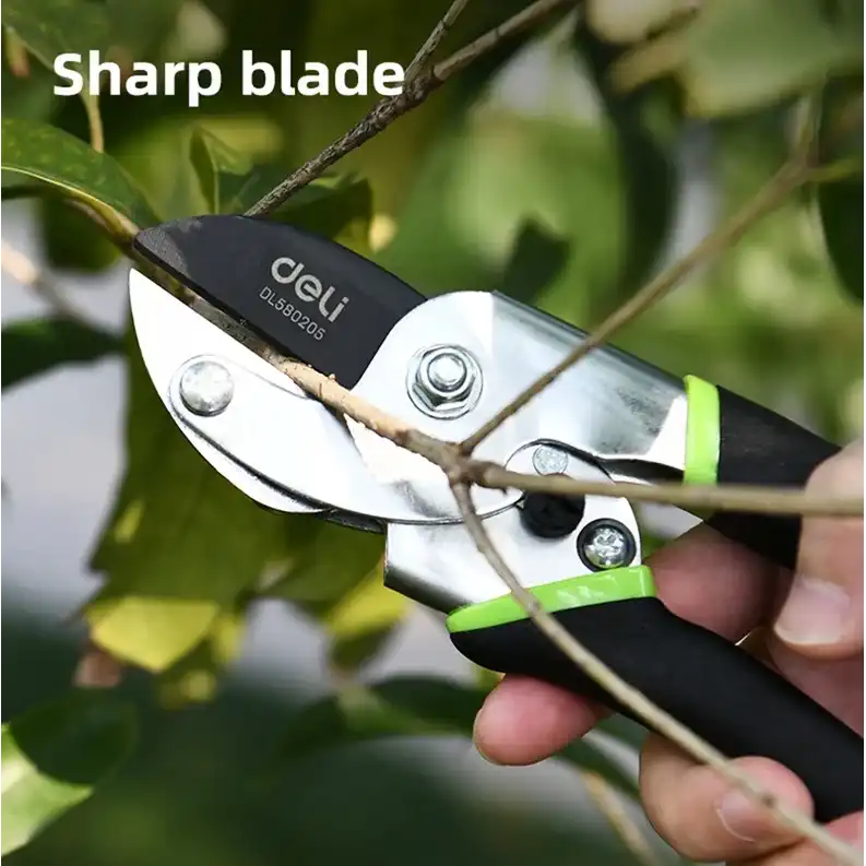 Универсальный садовый секатор Deli DL580205, сталь 55С, уплотнённая противоскользящая ручка 98487 используется для обрезки фруктовых деревьев, растений бонсай, садовых растений, цветов и кустов. Секатор без труда справится с ветками толщиной до 15мм. Инструмент изготовлен из высококачественной стали 55С с тефлоновым покрытием, которое не только обеспечивает защиту материала лезвия от коррозионного воздействия, повышая срок службы секатора, но и предотвращает прилипание мусора. Ручки с полипропиленовым и термопластичным покрытием удобно лежат в руке во время работы и не дают инструменту выскользнуть. Удобный фиксатор секатора надежно удерживает рукоятки в сведенном положении, предотвращая случайное раскрытие лезвий во время хранения или транспортировки, а возвратная пружина облегчает работу с инструментом и снижает усталость рук.