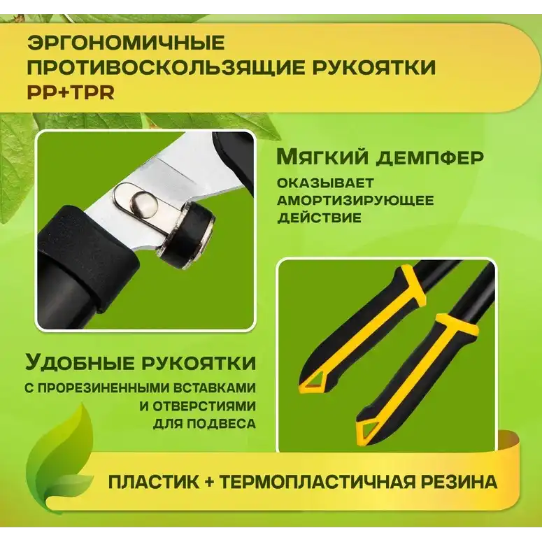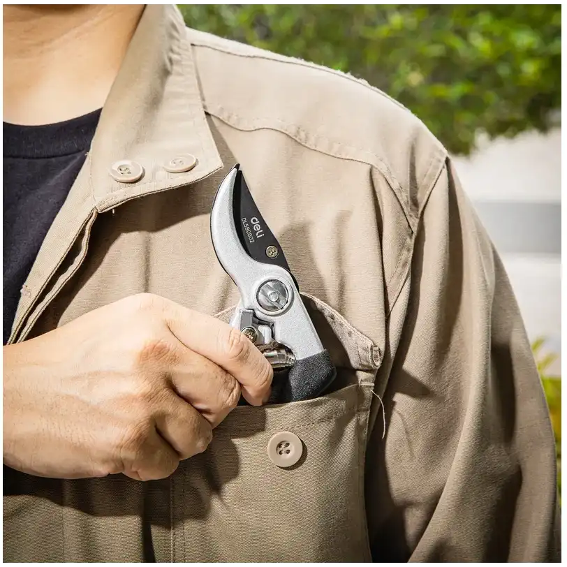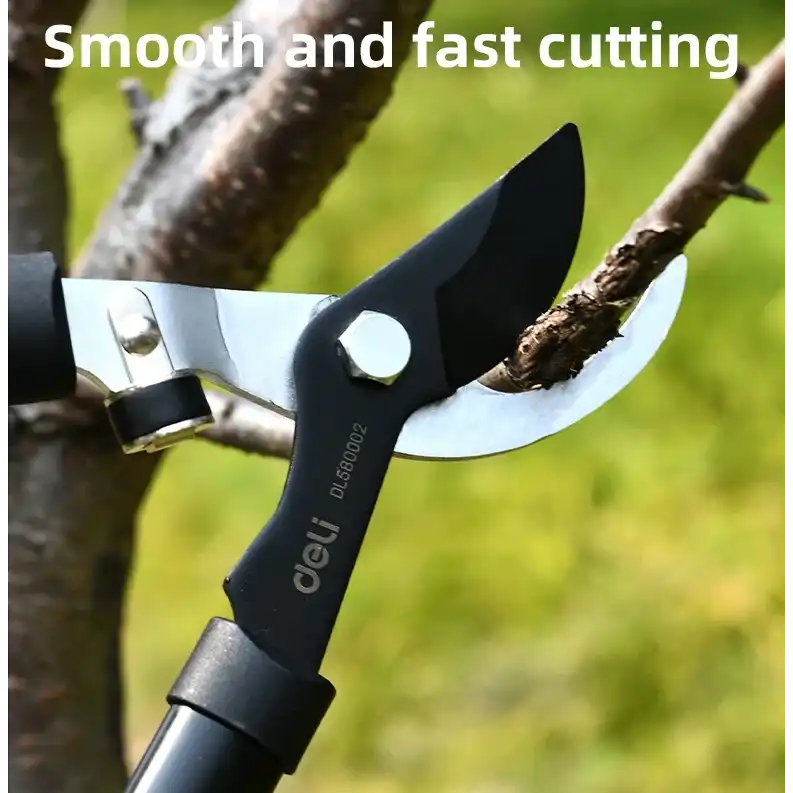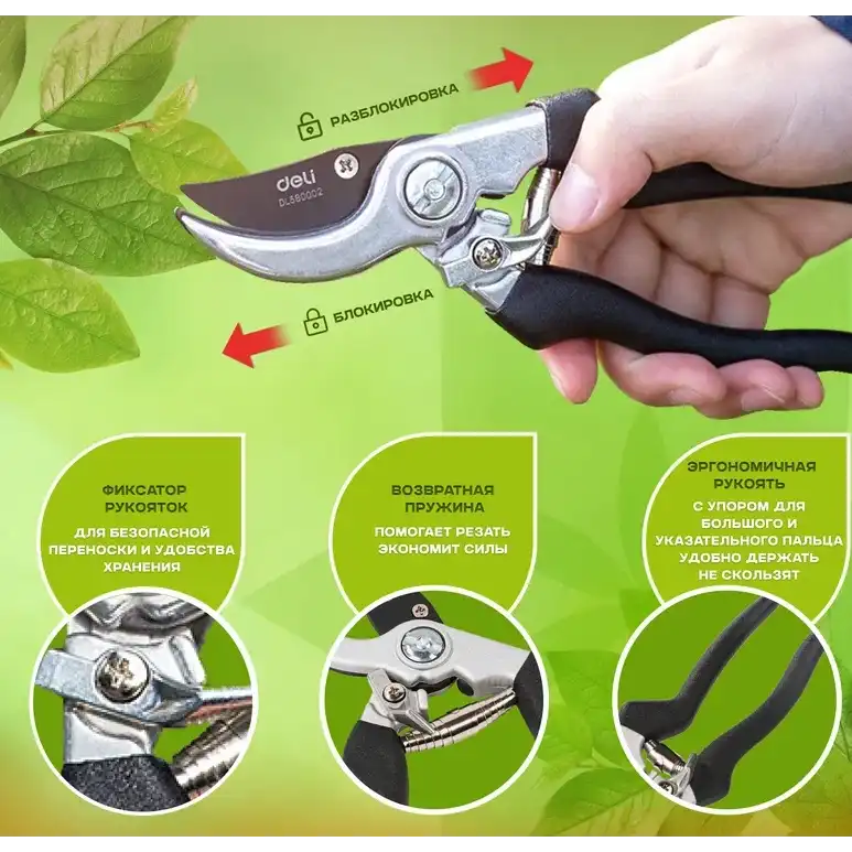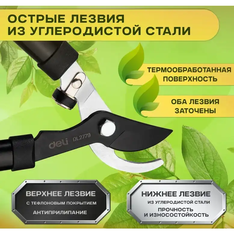 Набор сучкорез+секатор Deli DL580002 сталь 55С 98494 — универсальный комплект инструментов для ухода за садом. Сучкорез предназначен для резки толстых веток диаметром до 30 мм. Секатор без труда справится с ветками толщиной до 15 мм. Инструменты изготовлены из высококачественной стали 55С с тефлоновым покрытием, которое не только обеспечивает защиту материала лезвия от коррозионного воздействия, повышая срок службы секатора, но и предотвращает прилипание мусора. Ручки с полипропиленовым и термопластичным покрытием удобно лежат в руке во время работы и не дают инструменту выскользнуть. Удобный фиксатор секатора надежно удерживает рукоятки в сведенном положении, предотвращая случайное раскрытие лезвий во время хранения или транспортировки, а возвратная пружина облегчает работу с инструментом и снижает усталость рук.