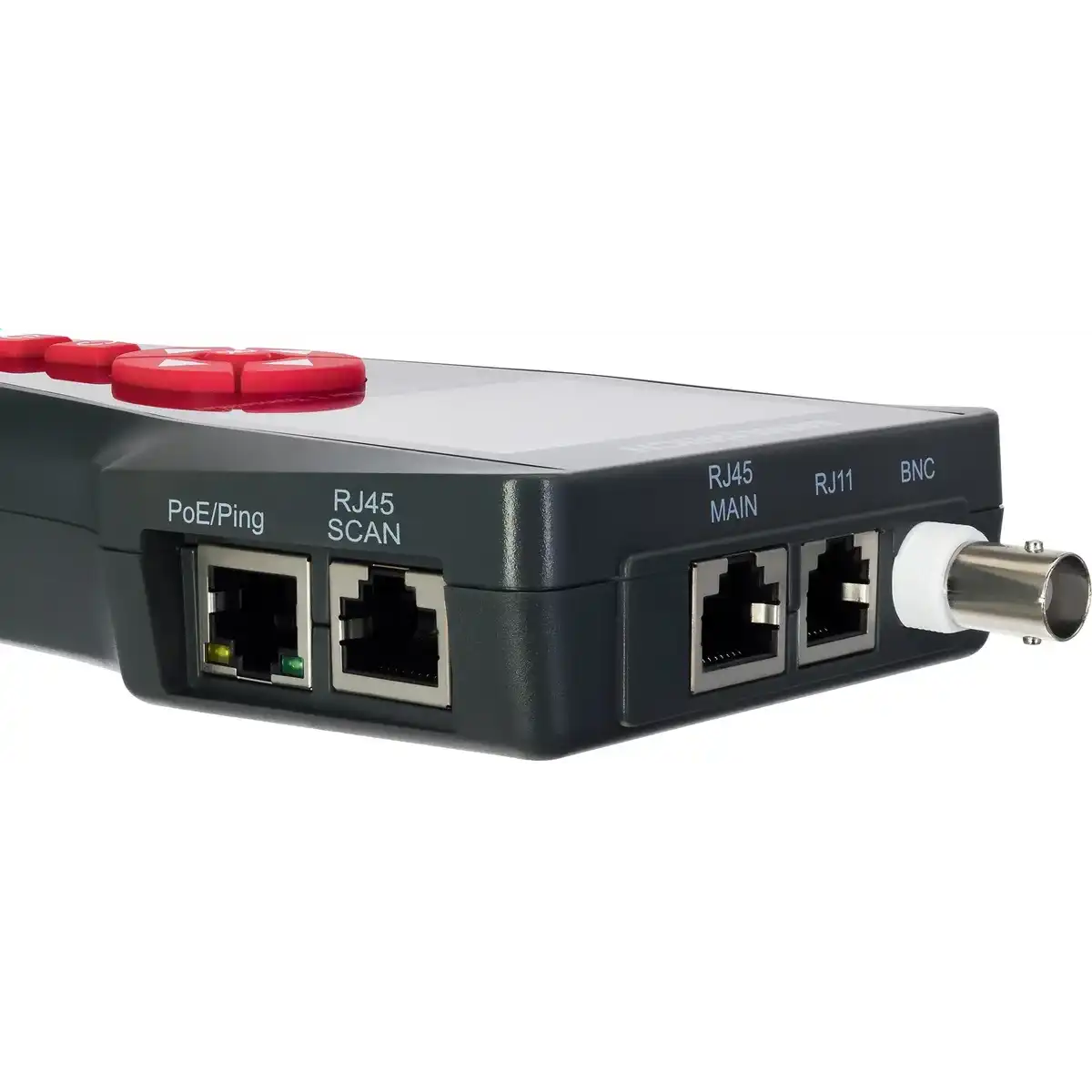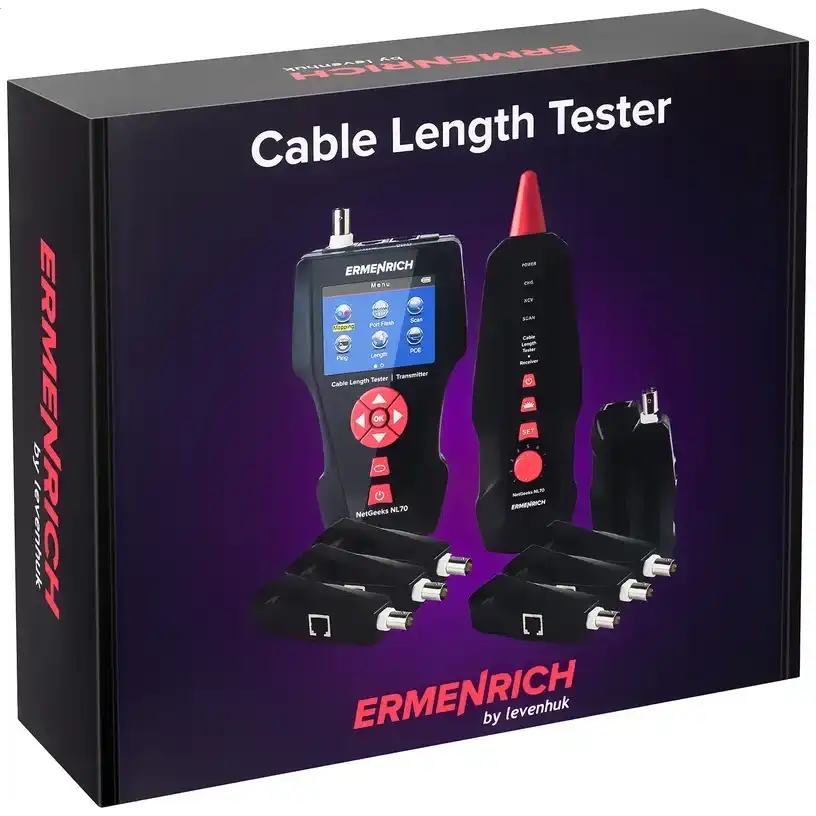 Устройство для измерения длины кабелей и для проведения сетевых тестов. Предназначен для работы с кабелями разных типов с проводниками из металла. Это могут быть сетевые (5E/6E), коаксиальные, телефонные кабели. Позволяет измерять длину до 1000 м. Комплектуется 8 модулями для дистанционного измерения длин. Для повышения точности измерений рекомендуется выполнять калибровку тестера. Используя Ermenrich NetGeeks NL70, можно обнаружить различные неисправности в электросети: короткое замыкание, обрыв линии, а также перекрещенные, расщепленные и перевернутые пары кабелей. Есть возможность определить, на каком расстоянии находится проблемное место. С помощью функции трассировки находят нужный кабель и определяют его направление. Порт подключения определяют с помощью функции Port Flash (проблесковая индикация). Прибор также позволяет выполнять тест PoE (проверку соединения Ethernet) и PING-тест (проверку скорости интернет-соединения), при этом результат можно сохранить на карту памяти. Измеритель оснащен цветным ЖК-дисплеем с диагональю 2,8′ и разрешением 320×240 пикс. Питание прибора осуществляется от литиевого аккумулятора емкостью 1800 мАч. Этого хватает примерно на 20 часов работы без подзарядки.