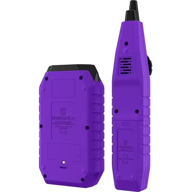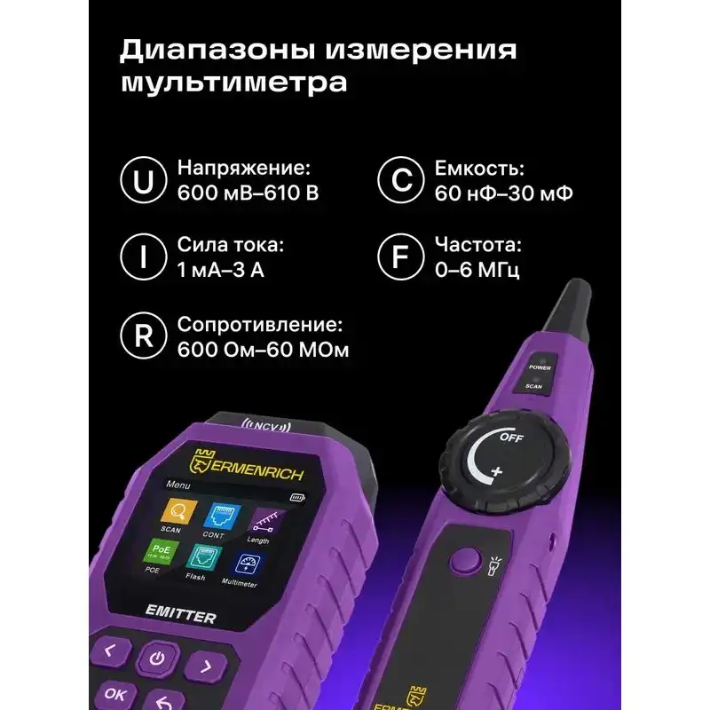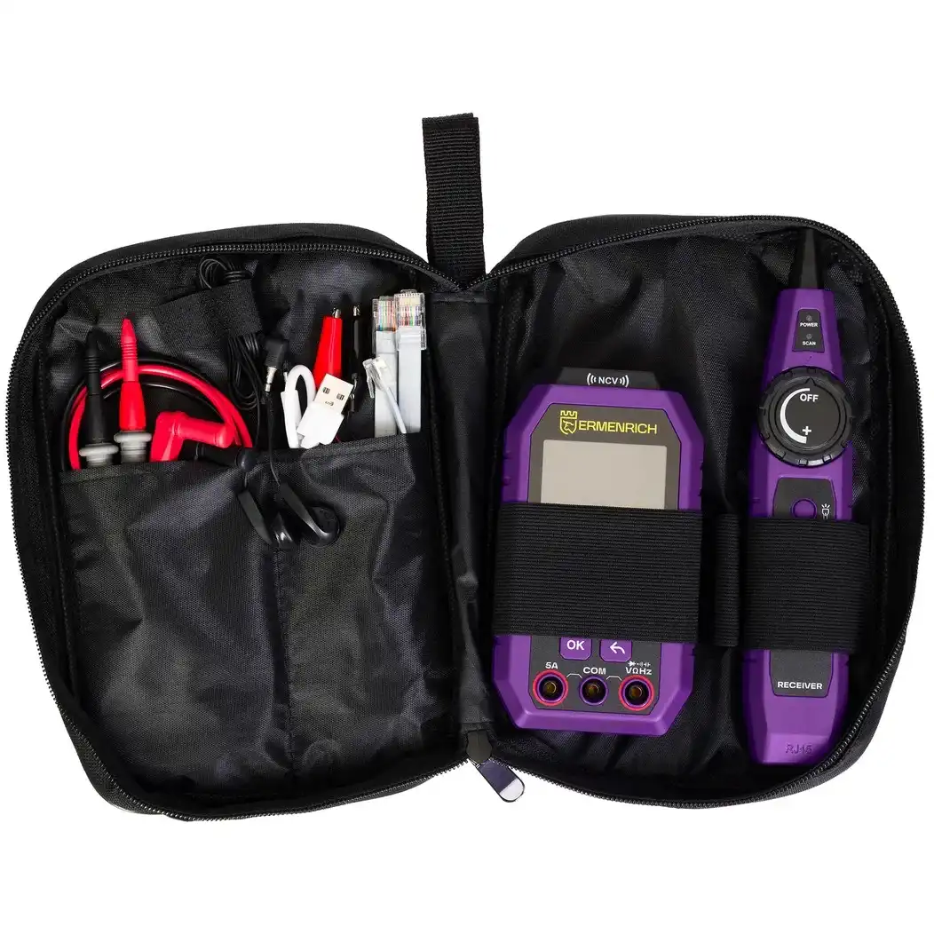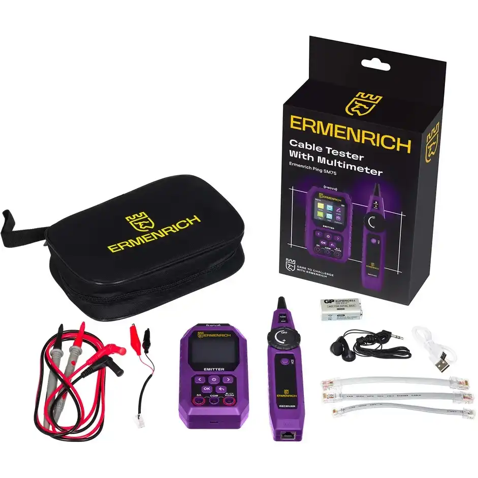 Кабельный тестер с мультиметром Ermenrich Ping SM75 – многофункциональный инструмент для определения состояния и всесторонней диагностики телефонных линий, компьютерных сетей и электрооборудования. Прибор предназначен для профессионалов, занимающихся монтажными работами и обслуживанием сетей в промышленных, офисных и домашних условиях. Тестер используется для поиска витой пары, трассировки, определения длины кабеля (до 200 метров, с погрешностью ±3 м), дистанции до короткого замыкания или обрыва. Ermenrich Ping SM75 отличается от аналогичных приборов широким спектром функций. Он позволяет провести тест PoE c определением типа питающего оборудования по стандарту IEEE 802.3af/at, имеет функции NCV (бесконтактное определение опасного напряжения) и Port Flash, подходит для тестирования сетевых кабелей STP/UTP категорий 5E/6/6A. Также заменяет собой цифровой мультиметр, измеряя напряжение (постоянное и переменное), ток (постоянный и переменный), сопротивление, частоту и емкость. Результаты измерений отображаются на цветном TFT-экране передатчика с разрешением 320х240 пикс. В комплект поставки входят передатчик, приемник с разъемом для подключения наушников (входят в комплект) и портом RJ45, тестовые щупы для мультиметра. Работа передатчика осуществляется от встроенного аккумулятора 3,7 В (адаптер для зарядки приобретается отдельно), а приемник питается от одной батарейки 9 В. Основные особенности: Измерение длины кабеля до 200 метров, с погрешностью не более 3 метров Диапазон трассировки – от 0 до 1000 метров Функции NCV, Port Flash, тест PoE, определение полярности Мультиметр: вольтметр, амперметр, омметр, измеритель емкости, частотомер Быстрое определение расстояния до обрыва, короткого замыкания или перекрещенных пар Яркий цветной TFT-дисплей для отображения результатов тестирования сети Комплектация: Передатчик Приемник Наушники Щуп – 2 шт. Кабель USB Type-C Сумка Инструкция по эксплуатации и гарантийный талон